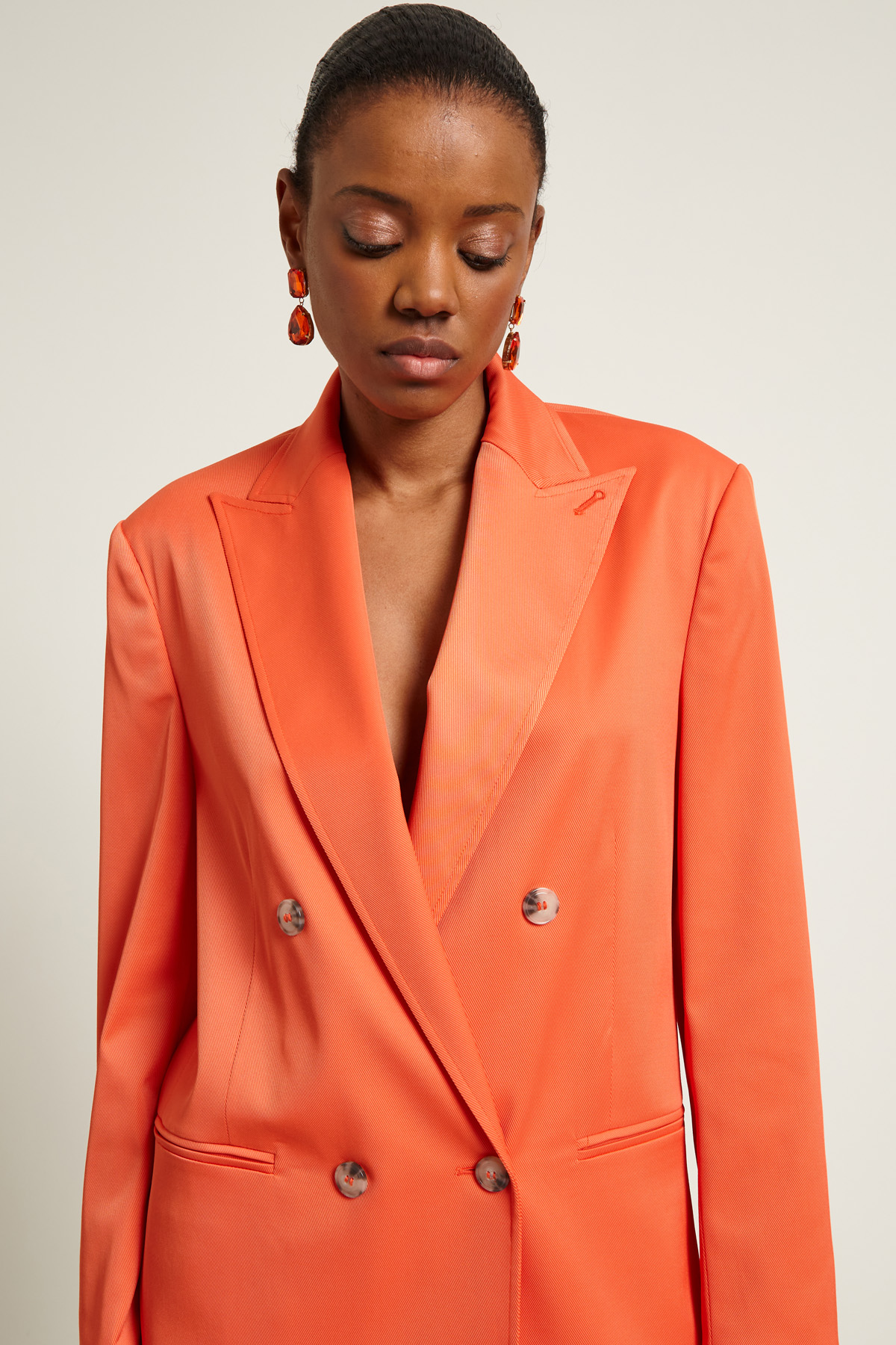 Blazer dalla linea dritta realizzato in tricotina di misto viscosa con collo rever, maniche lunghe con spacchetto e bottoni, tasche a doppio filetto e spacco nel retro. Allacciatura doppiopetto tramite bottoni a vista. Capo foderato.
