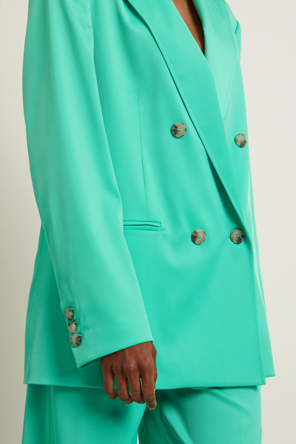 Blazer dalla linea dritta realizzato in tricotina di misto viscosa con collo rever, maniche lunghe con spacchetto e bottoni, tasche a doppio filetto e spacco nel retro. Allacciatura doppiopetto tramite bottoni a vista. Capo foderato.