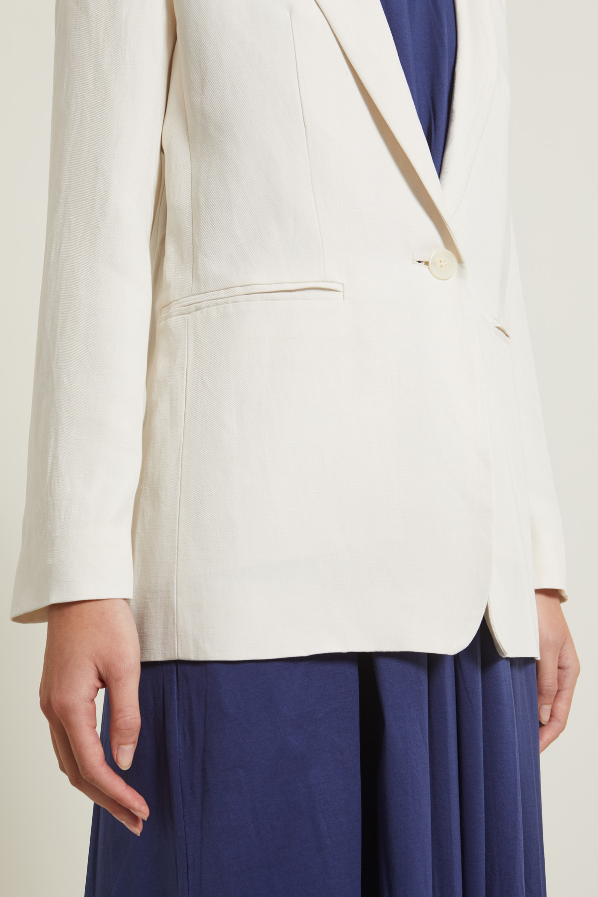 Blazer dalla linea dritta realizzato in tessuto diagonale fiammato di misto lino, con collo a rever, maniche lunghe, tasche a doppio filetto e spacco nel retro. Allacciatura monopetto tramite bottone. Foderato.