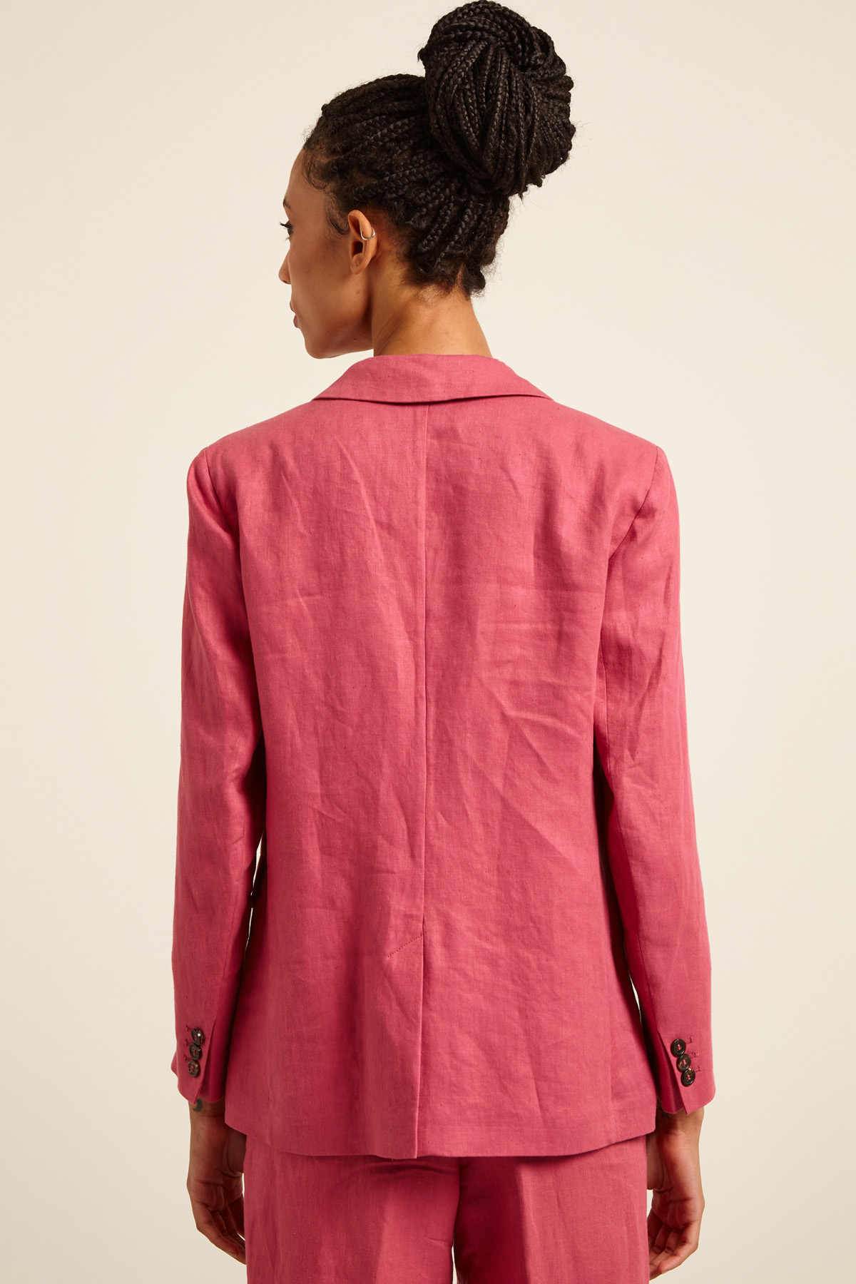 Blazer dalla linea dritta realizzato in tela di puro lino, con collo a rever, maniche lunghe con spacchetto e bottoni al fondo, tasche a filetto con patta, spacco nel retro. Allacciatura monopetto tramite bottoni. Semifoderato.