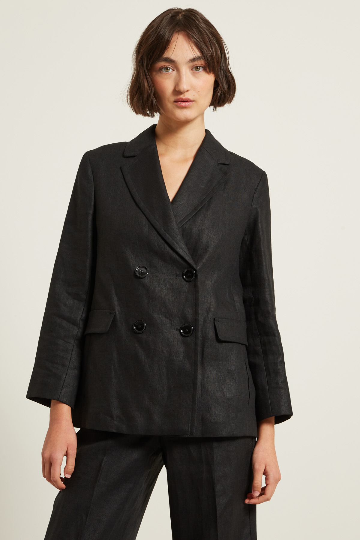 Blazer dalla linea dritta realizzato in tela di puro lino, con collo a rever, maniche lunghe con spacchetto al fondo, tasche a filetto con patta decorativa, spacco nel retro. Allacciatura doppiopetto tramite bottoni. Semifoderato.