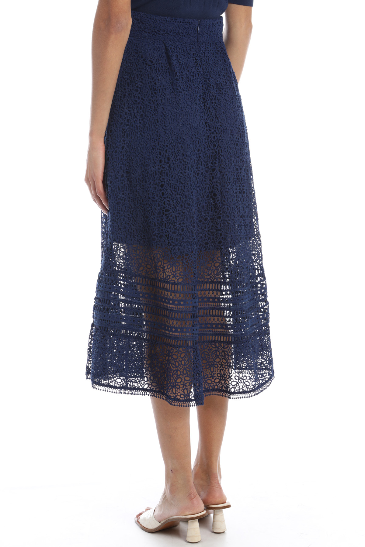 Gonna dalla linea svasata al fondo realizzata in pizzo macramé, con pieghe in vita, motivo di trasparenza al fondo e allacciatura con zip invisibile nel retro. Capo foderato.