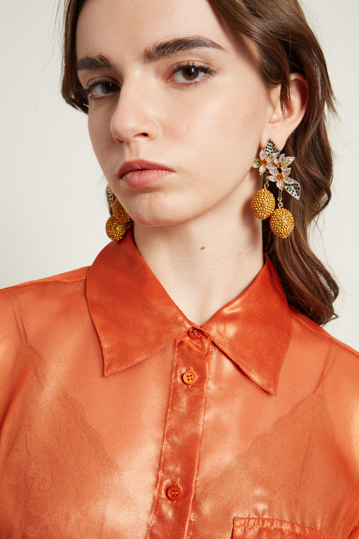 Camicia dalla linea fluida realizzata in georgette dal finish laminato. Modello con colletto classico, maniche lunghe con polsino e bottoni, taschino con patta applicato al petto, spacchetti al fondo, carrè e cannoncino nel retro. Allacciatura tramite bottoni a vista.