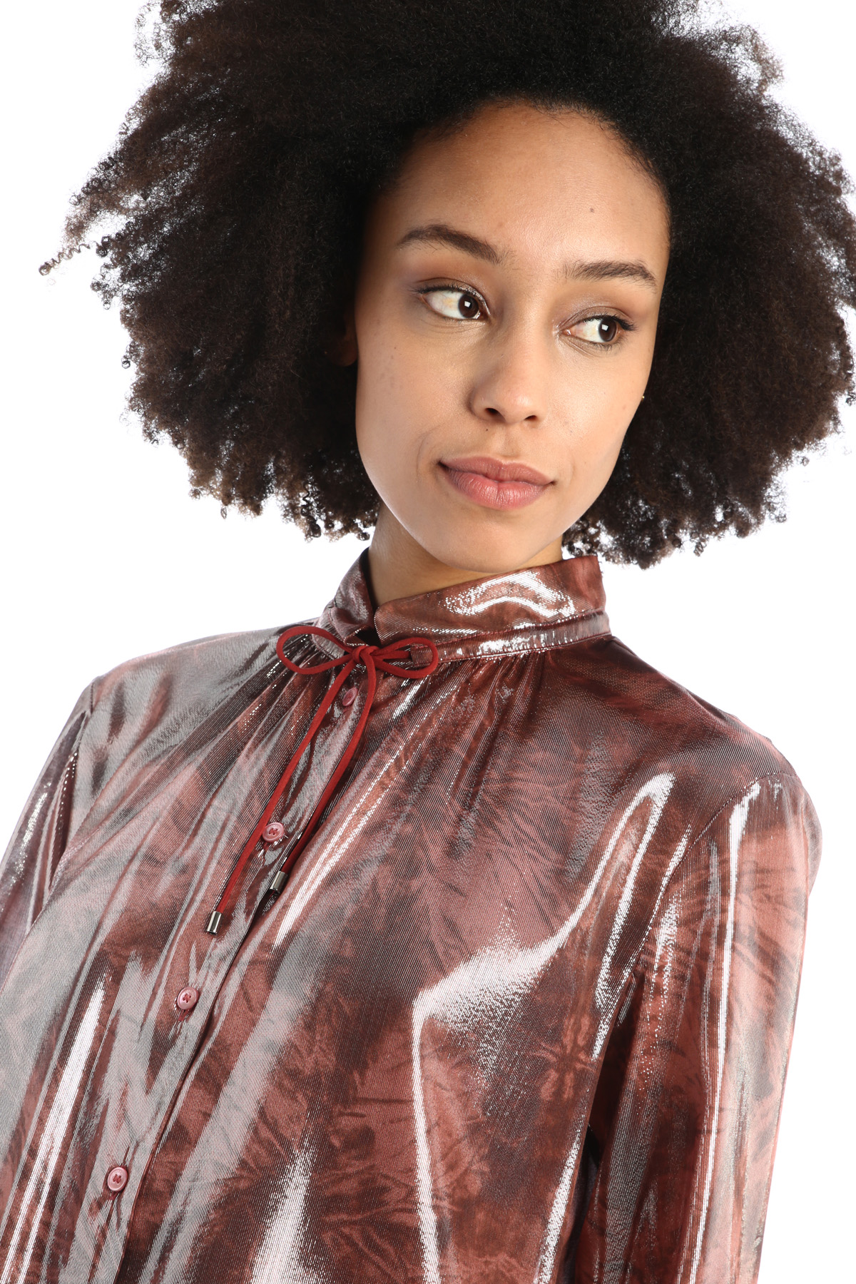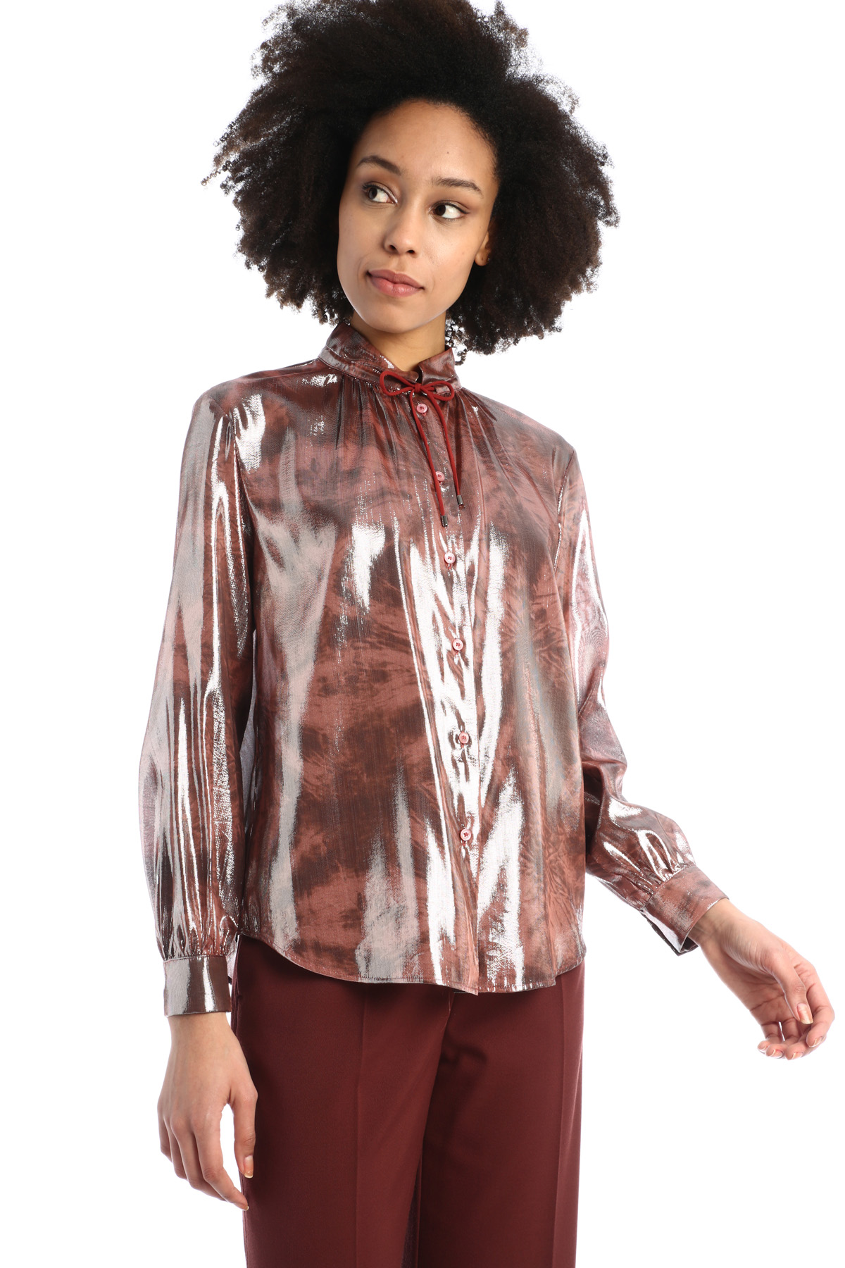 Camicia dalla linea morbida realizzata in seta lamé stampata, con collo a listino con coulisse e arriccio, maniche leggermente a sbuffo, polsino con bottone e orlo stondato. Allacciatura tramite bottoni.
