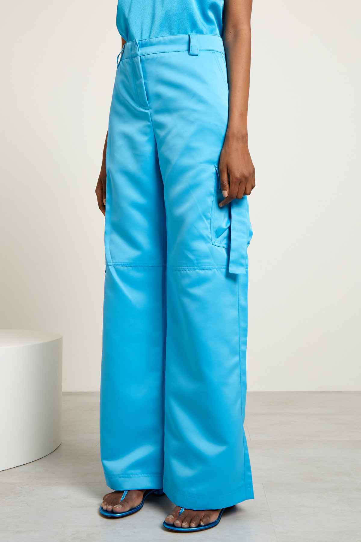 Pantaloni a palazzo stile cargo realizzati in raso, con passanti in vita, tasche alla francese davanti e a filetto con patta nel retro. Tasche applicate con patta e bottone. Allacciatura nascosta tramite zip, bottone e gancio.