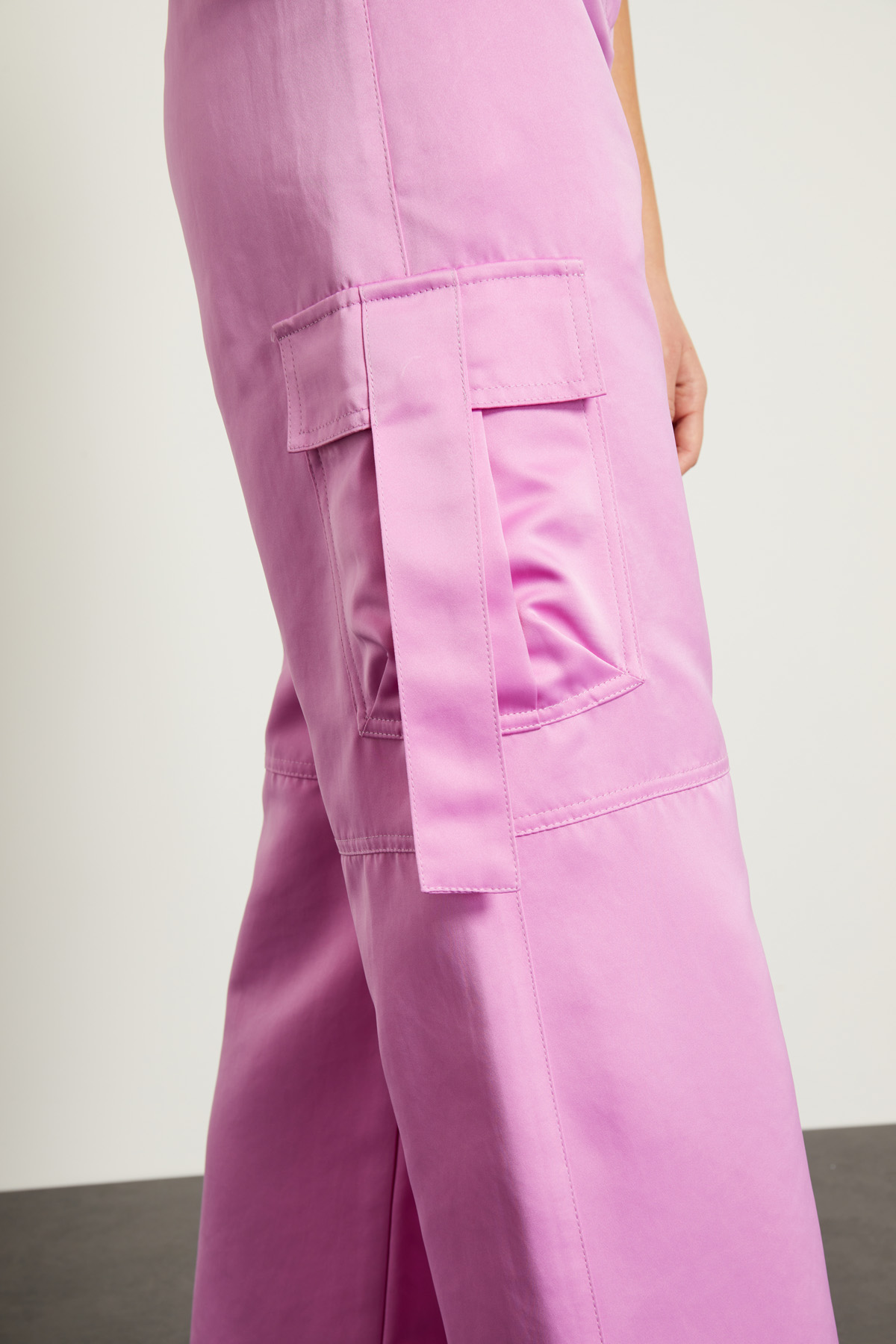 Pantaloni a palazzo stile cargo realizzati in raso, con passanti in vita, tasche alla francese davanti e a filetto con patta nel retro. Tasche applicate con patta e bottone. Allacciatura nascosta tramite zip, bottone e gancio.