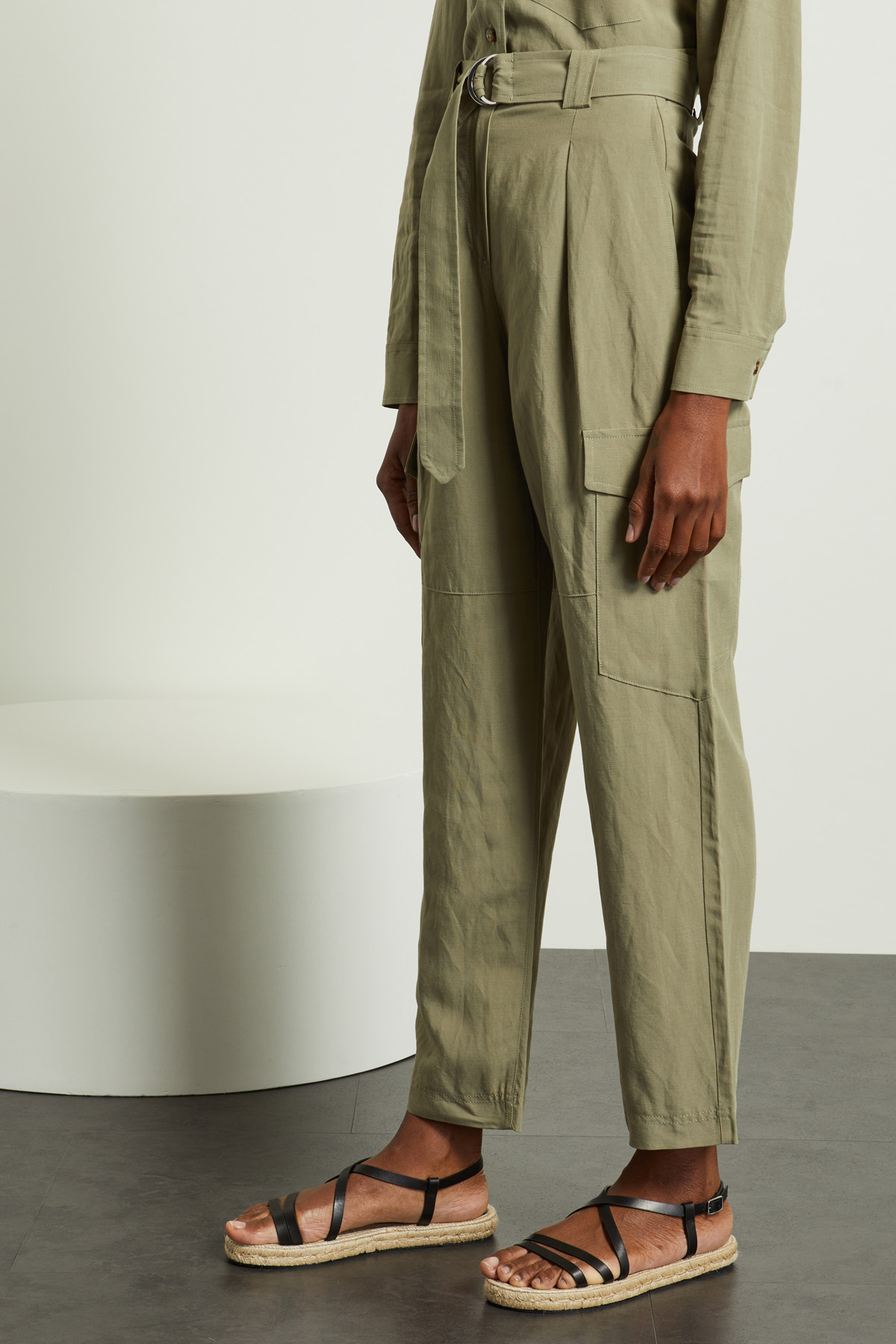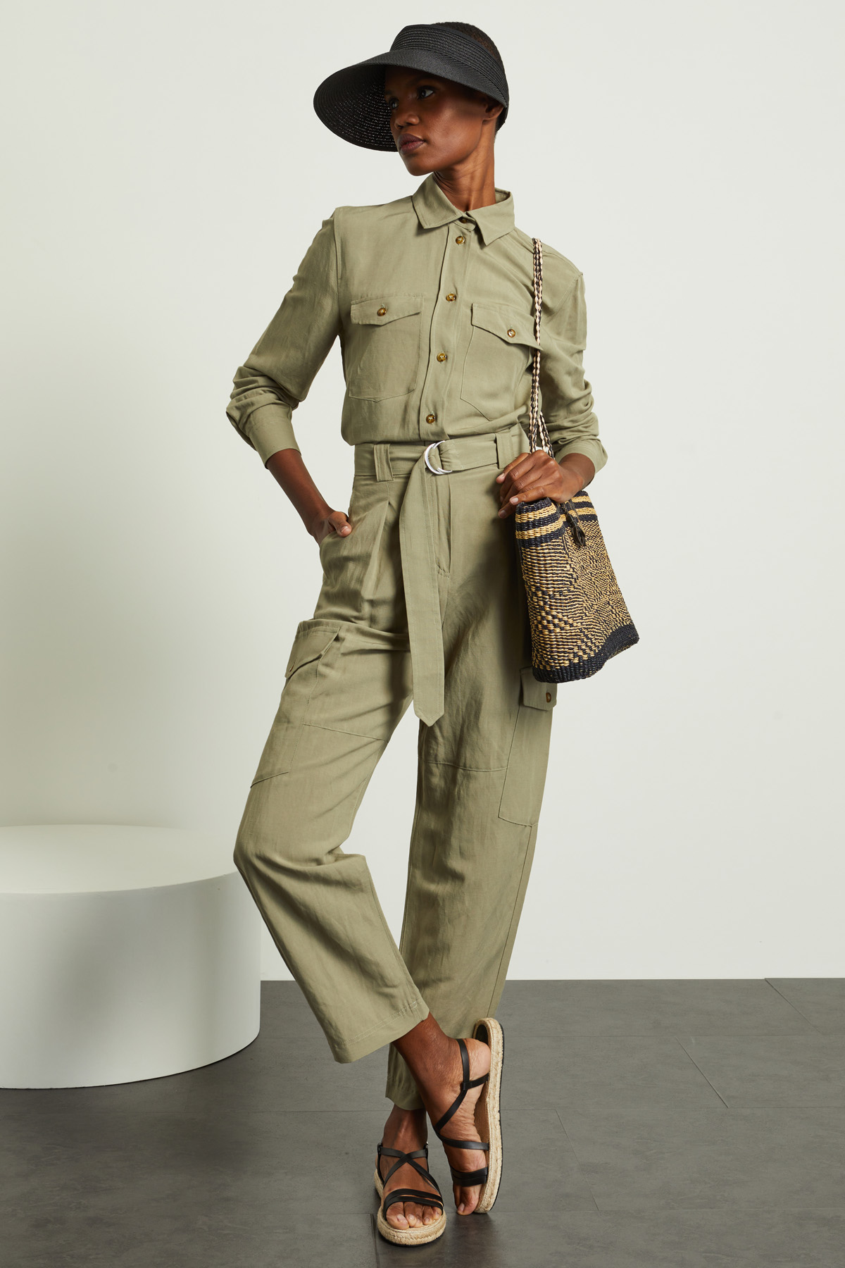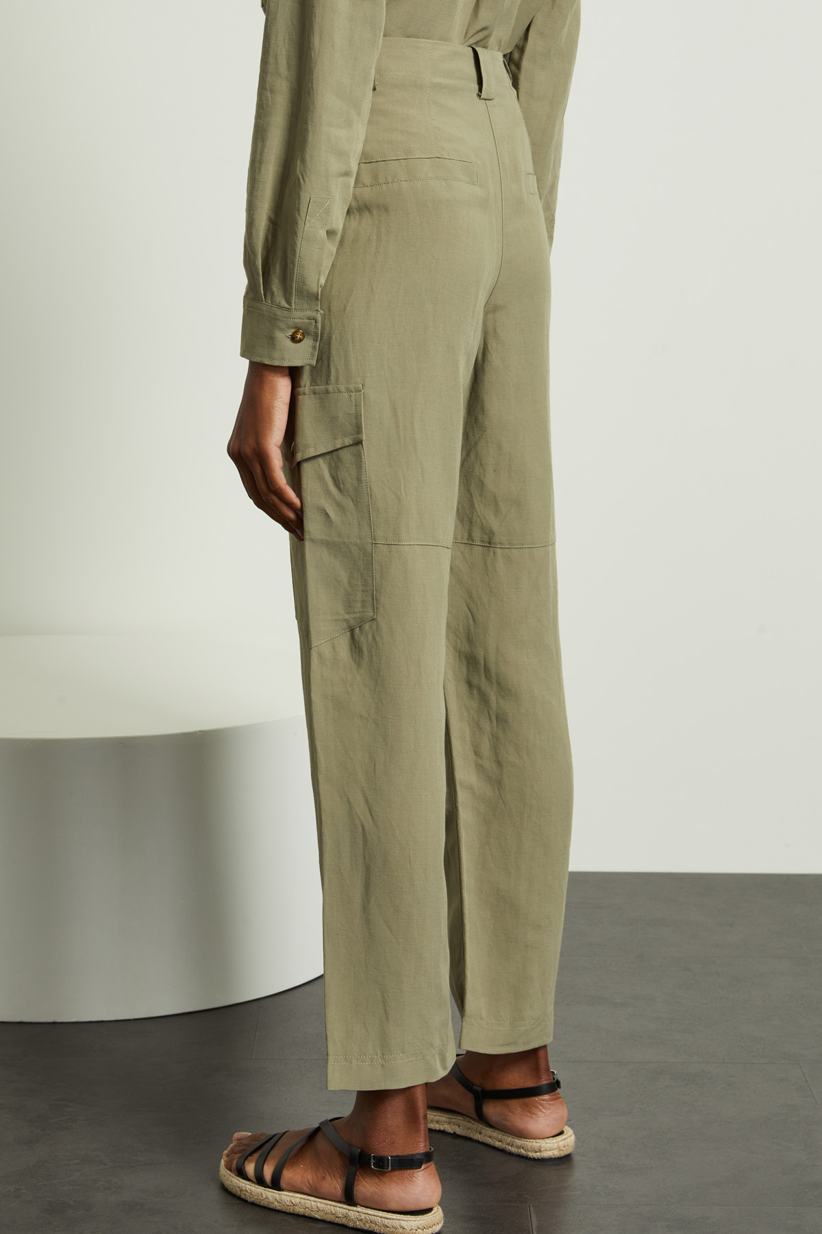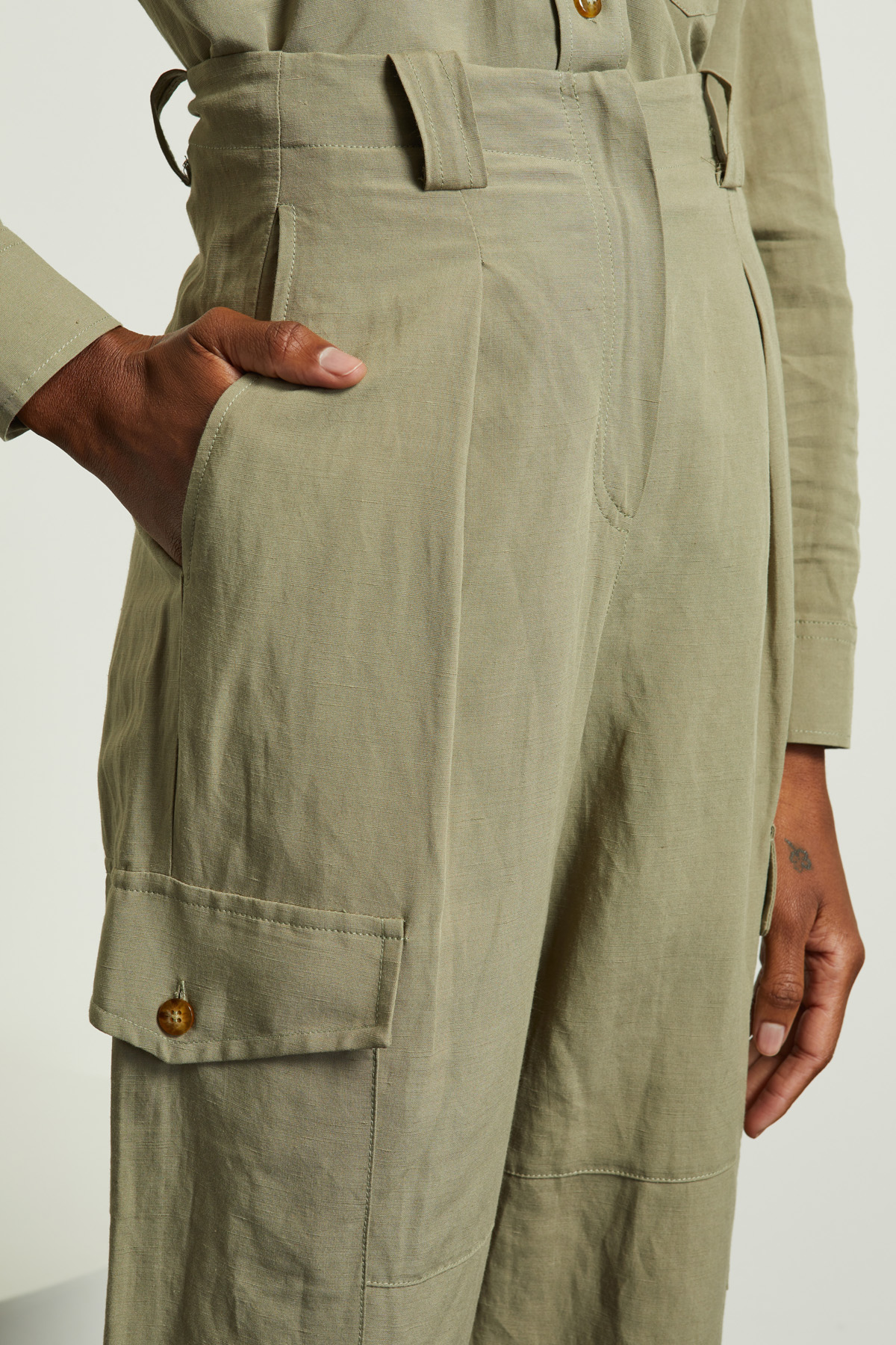 Pantaloni carrot realizzati in tela di misto lino, con passanti in vita tasche inserite in cucitura e applicate con patta sul davanti, a filetto nel retro. Allacciatura tramite zip e cintura coordinata con fibbia in metallo.