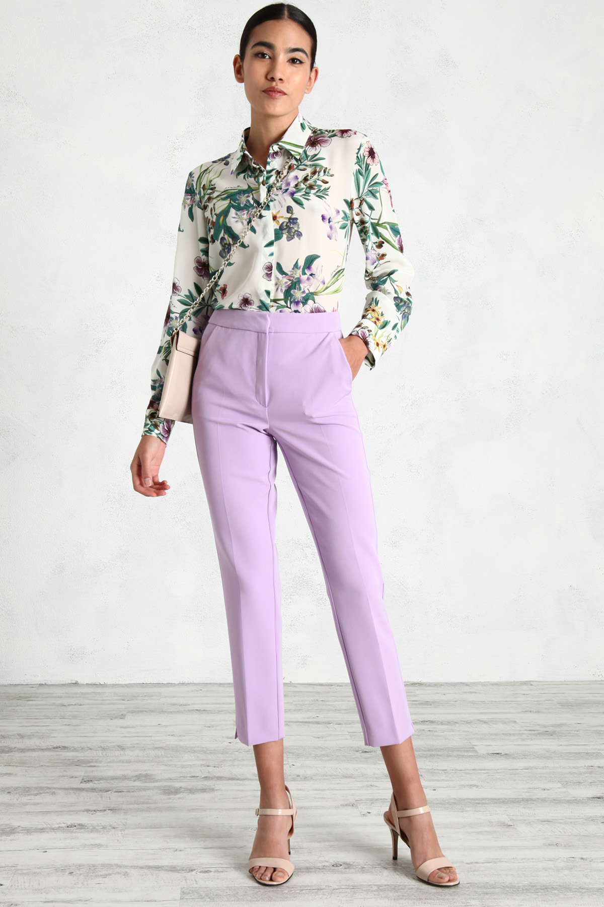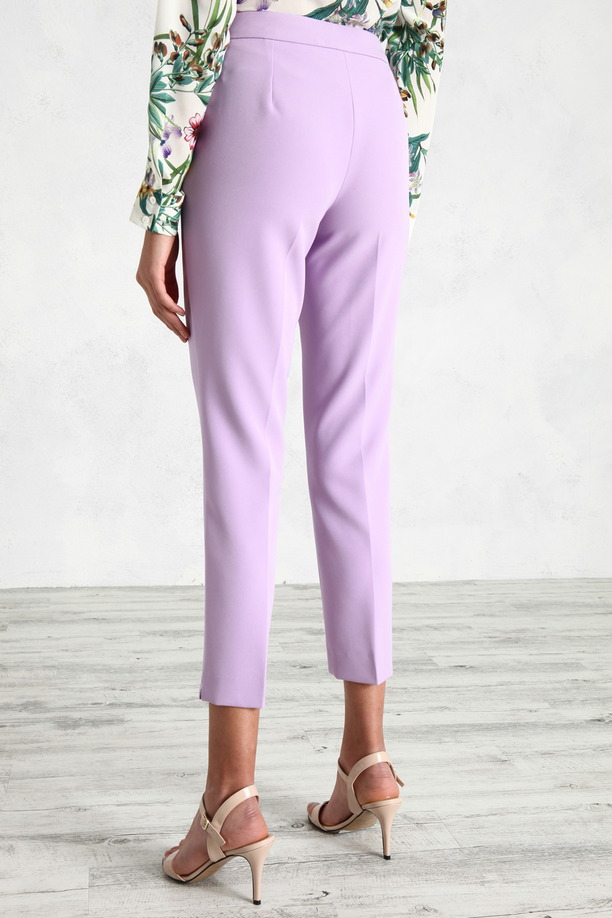 Pantaloni a sigaretta realizzati in tessuto fluido stretch, con tasche laterali alla francese e chiusura tramite zip, bottone e gancio.