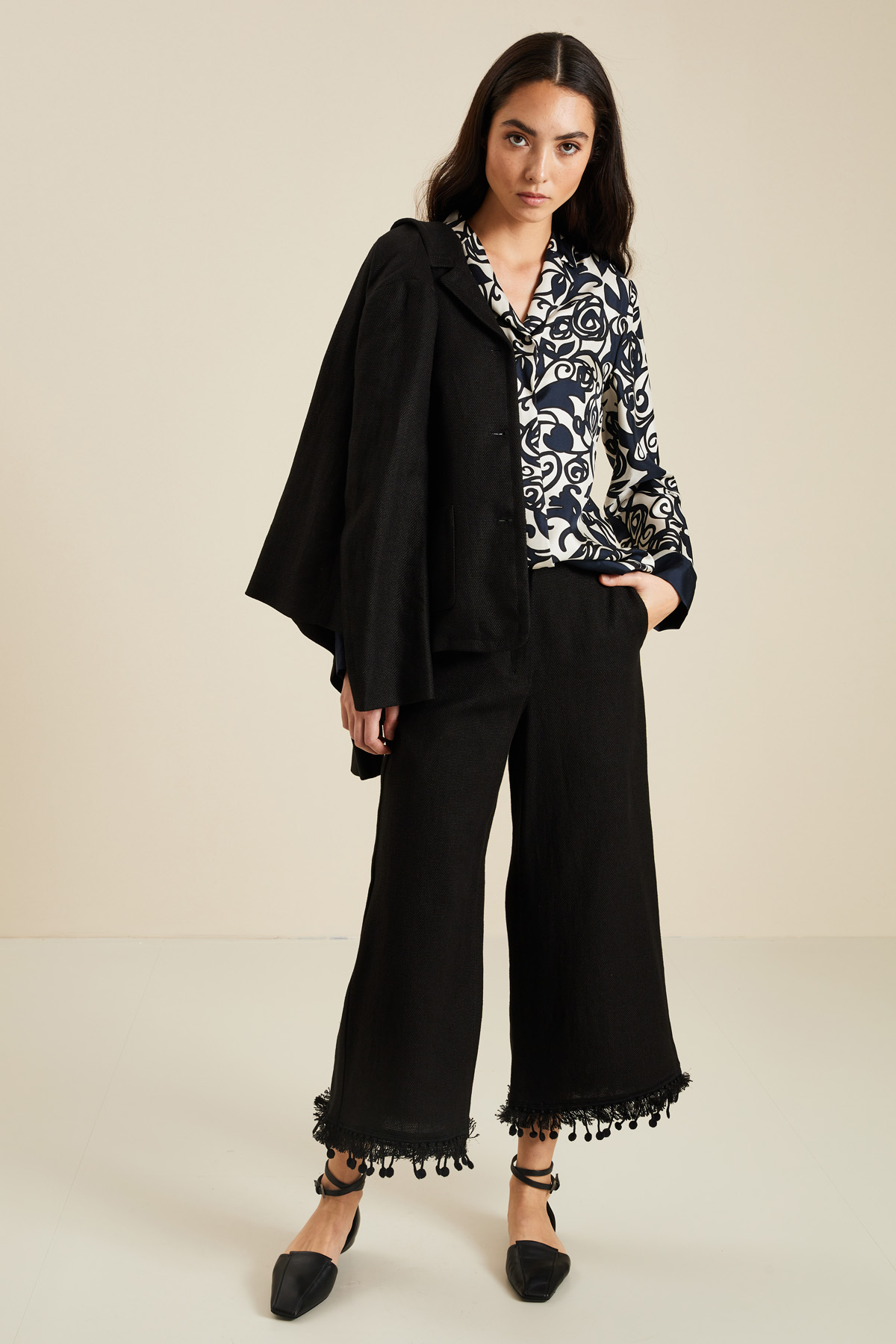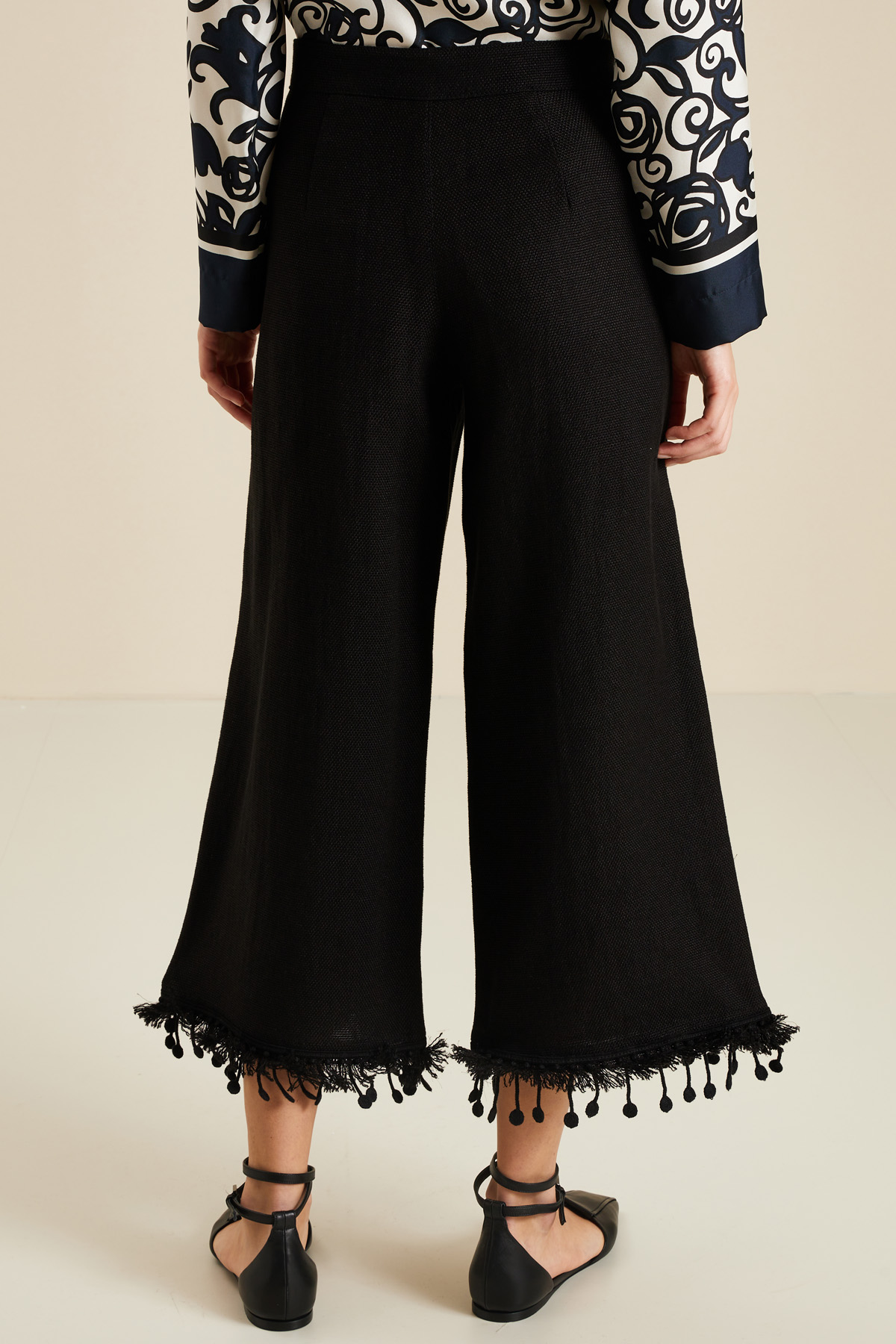 Pantaloni ampi dalla linea svasata realizzati in stuoia di misto lino e cotone stretch, con tasche alla francese sui fianchi, motivo di frange e passamaneria a fondo capo, allacciatura nascosta tramite zip, bottone e gancio.