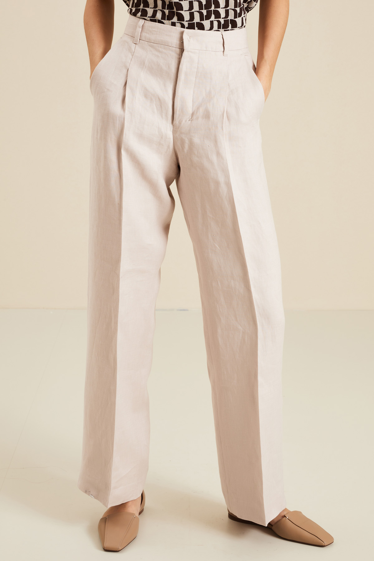 Pantaloni dalla linea dritta realizzati in tela di puro lino, con passanti in vita, tasche alla francese sul davanti, dettaglio di pieghe cucite e allacciatura nascosta tramite zip, bottone e gancio.