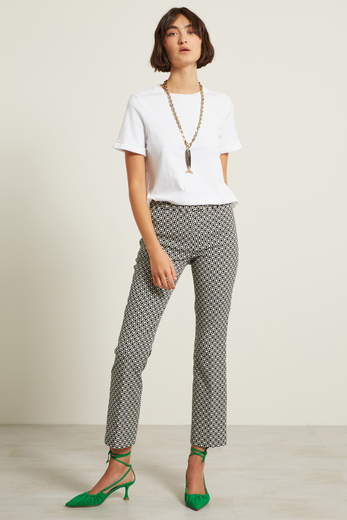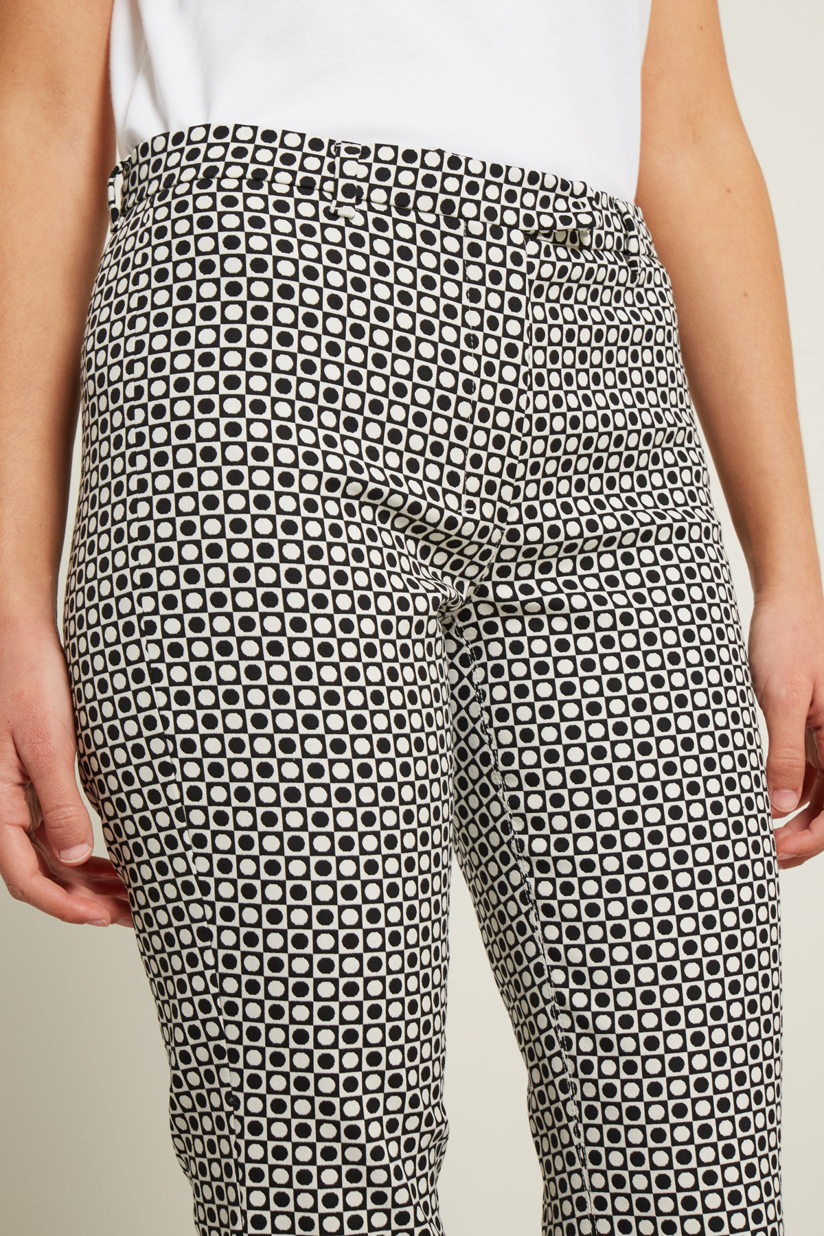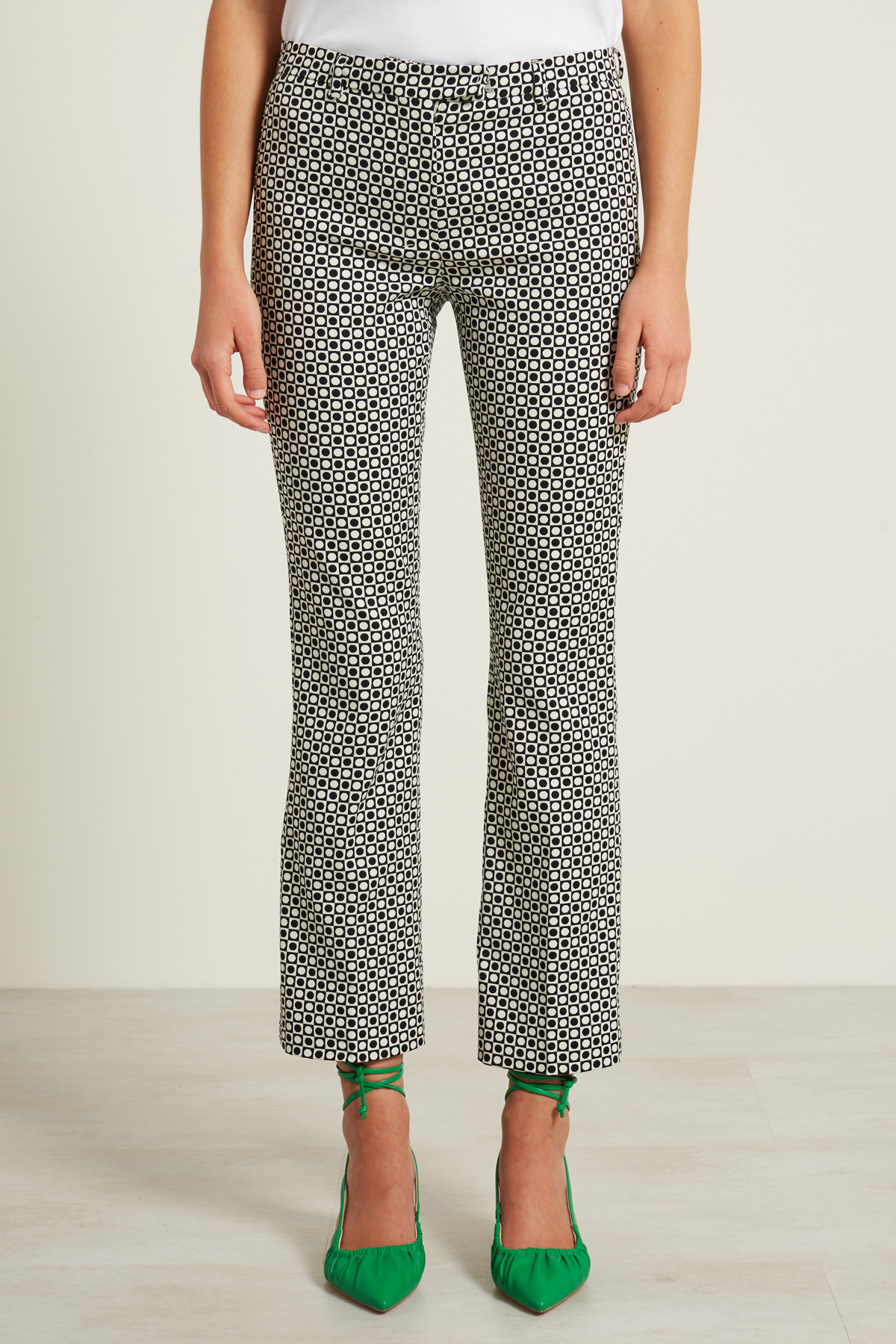 Pantaloni a trombetta realizzati in tela di misto cotone stretch jacquard con passanti in vita. Allacciatura nascosta tramite zip, bottone e gancio.