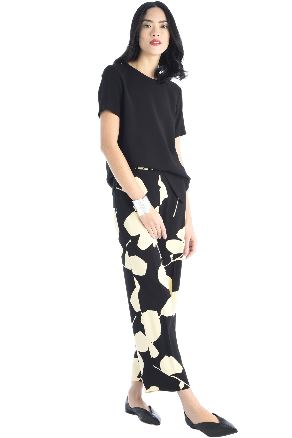 Pantaloni dritti dalla linea fluida realizzati in cady di viscosa stampato, con piega stirata e chiusura con zip invisibile sul fianco.
