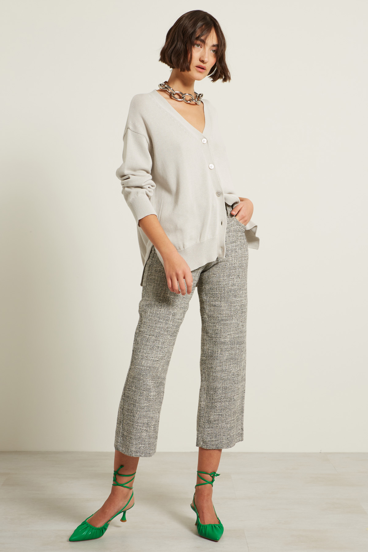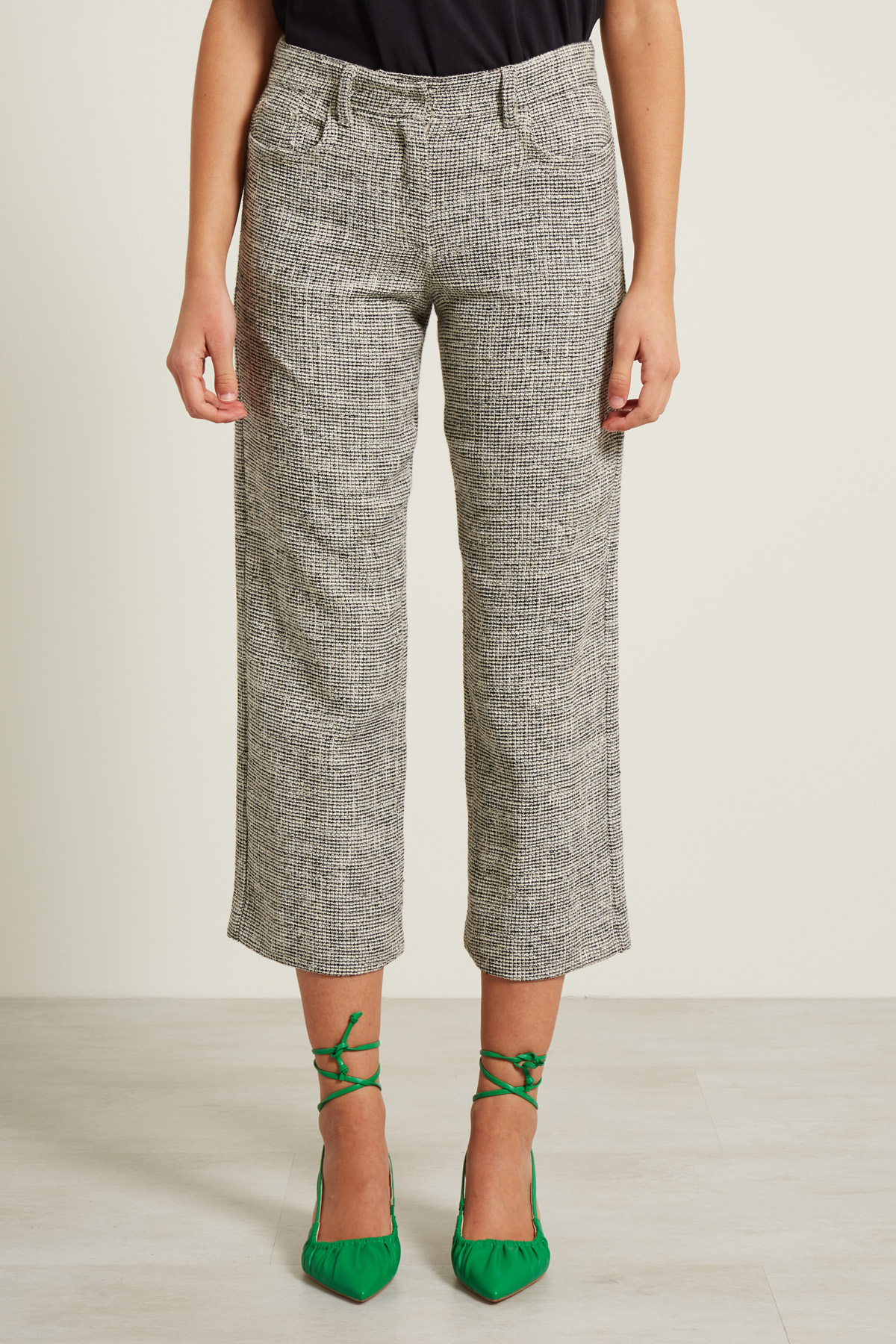 Pantaloni cropped dalla linea leggermente svasata al fondo realizzati in stuoia di misto cotone tinto filo con passanti in vita e cinque tasche. Allacciatura nascosta tramite zip, bottone e gancio.