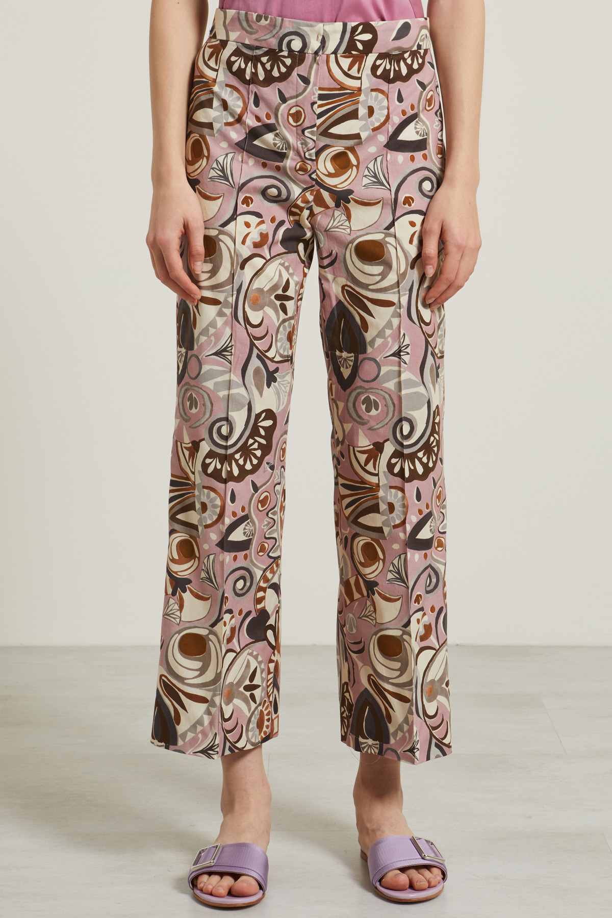 Pantaloni dalla linea leggermente flare realizzati in popeline di cotone stretch stampato, con dettaglio di pieghe cucite davanti e dietro, cintone in vita e allacciatura nascosta tramite zip, bottone e gancio.