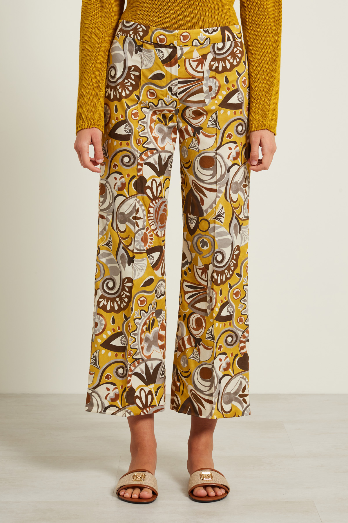 Pantaloni dalla linea leggermente flare realizzati in popeline di cotone stretch stampato, con dettaglio di pieghe cucite davanti e dietro, cintone in vita e allacciatura nascosta tramite zip, bottone e gancio.