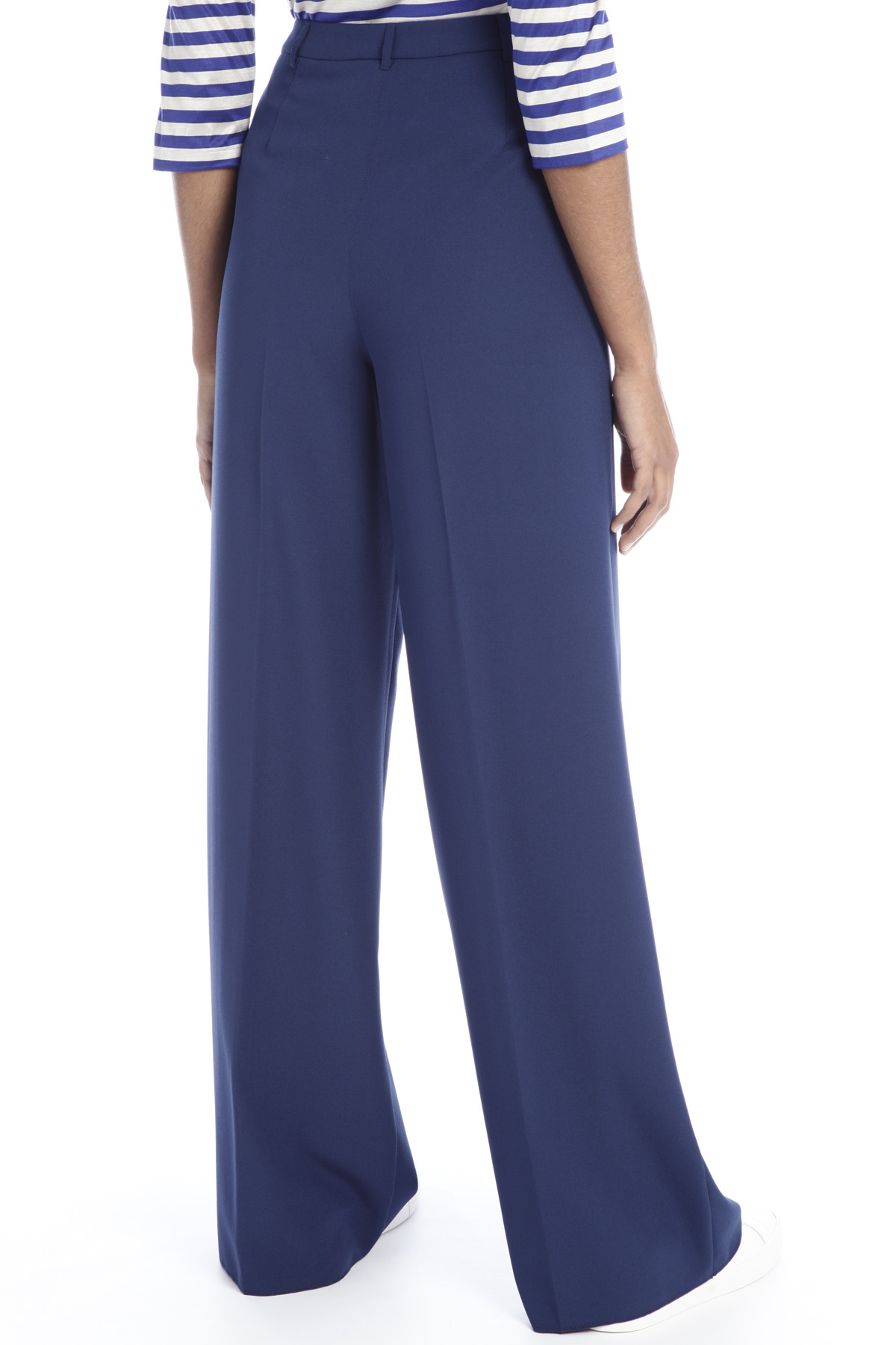 Pantaloni a palazzo realizzati in tessuto crêpe stretch, con passanti in vita, piega stirata, tasche alla francese ai fianchi e allacciatura coperta tramite zip e gancio.