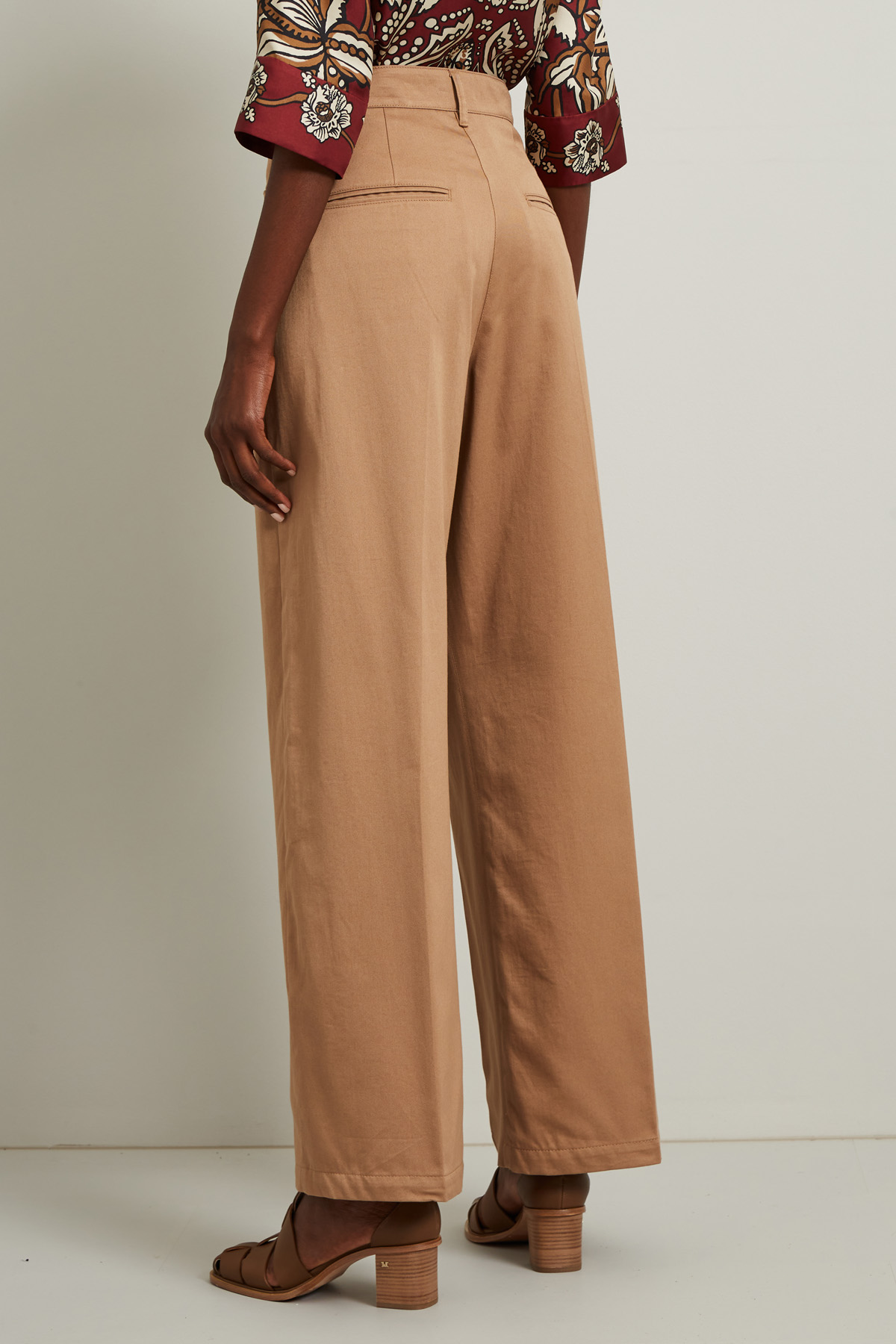 Pantaloni dalla linea svasata realizzati in gabardina di puro cotone, con passanti in vita, cinque tasche e piega stirata in lunghezza. Allacciatura tramite zip, bottone e gancio.