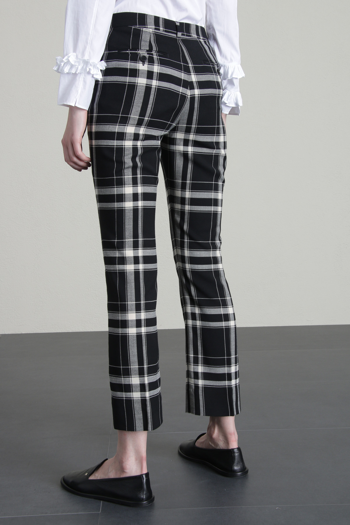 Pantaloni a trombetta realizzati in saia di misto lana e cotone stretch tinto filo, con passanti in vita, tasche alla francese sul davanti e a doppio filetto con bottone sul retro, allacciatura nascosta tramite zip, bottone e gancio.