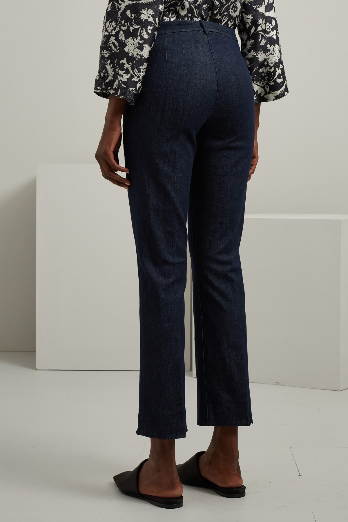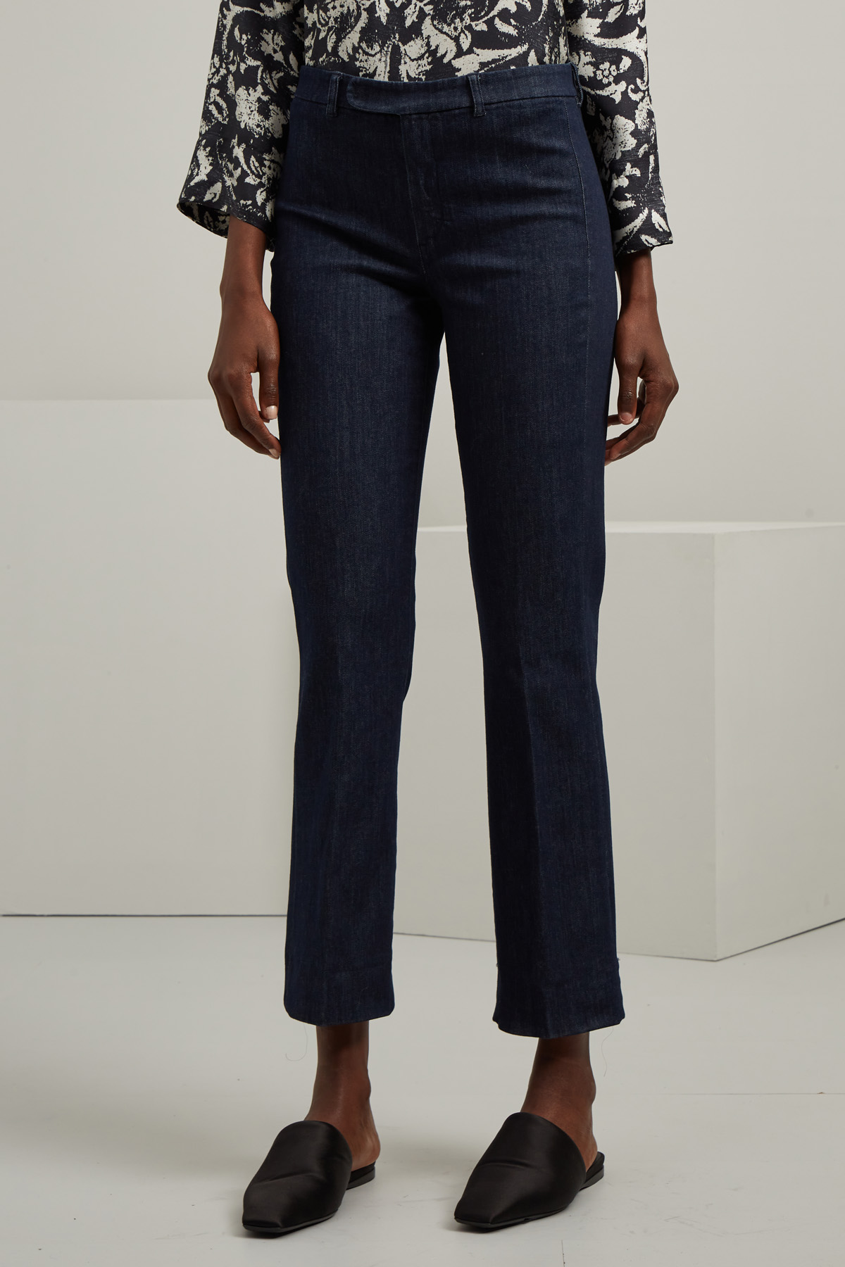 Pantaloni slim realizzati in denim di misto cotone stretch, con passanti in vita e piega stirata in lunghezza. Allacciatura nascosta tramite zip, bottone e ganci.