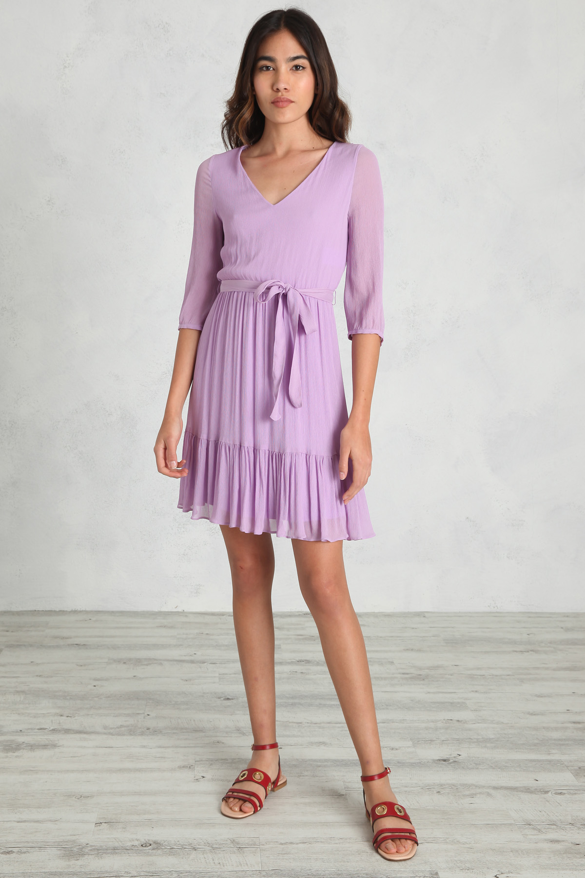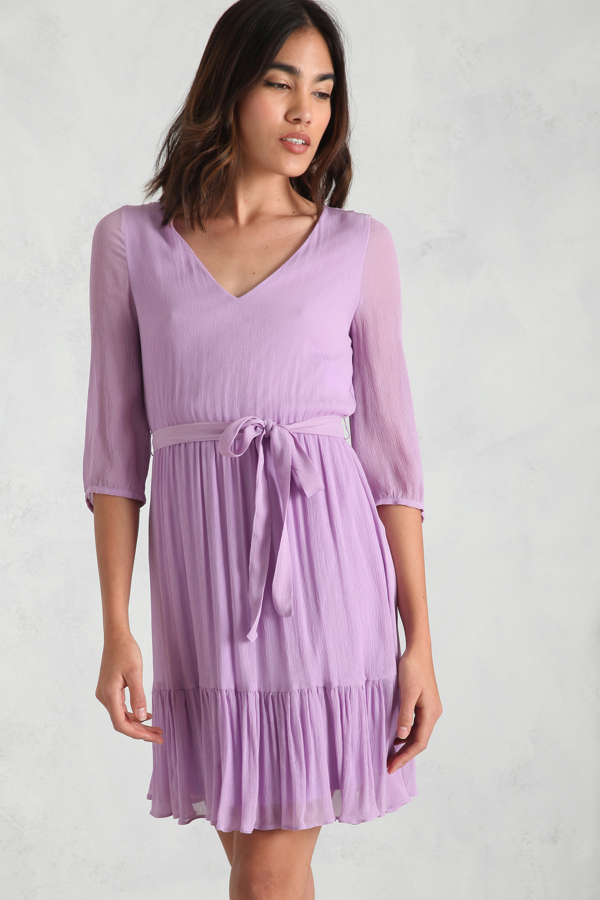 Abito dalla linea fluida realizzato in crêpe di misto seta, con scollo a V, maniche tre quarti, inserto elastico in vita e balza sul fondo. Foderato. Dotato di cintura coordinata.