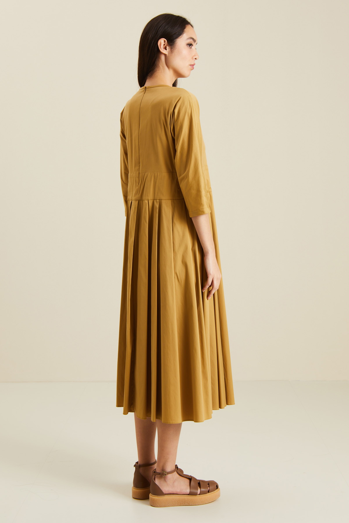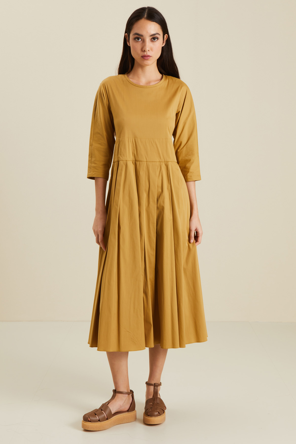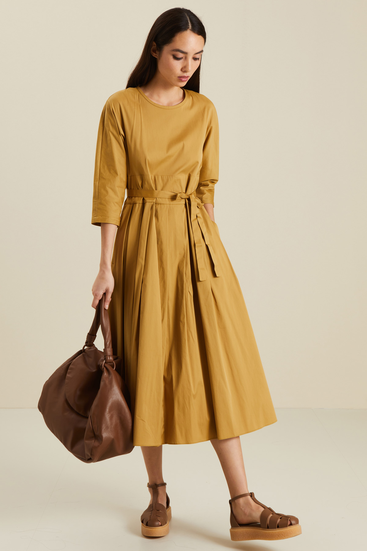 Abito dalla linea semiaderente realizzato in popeline di cotone stretch, con scollo a giro, maniche a kimono a tre quarti, passanti in vita e fusciacca abbinata, gonna a pieghe e tasche laterali inserite in cucitura. Chiusura tramite zip invisibile dietro.