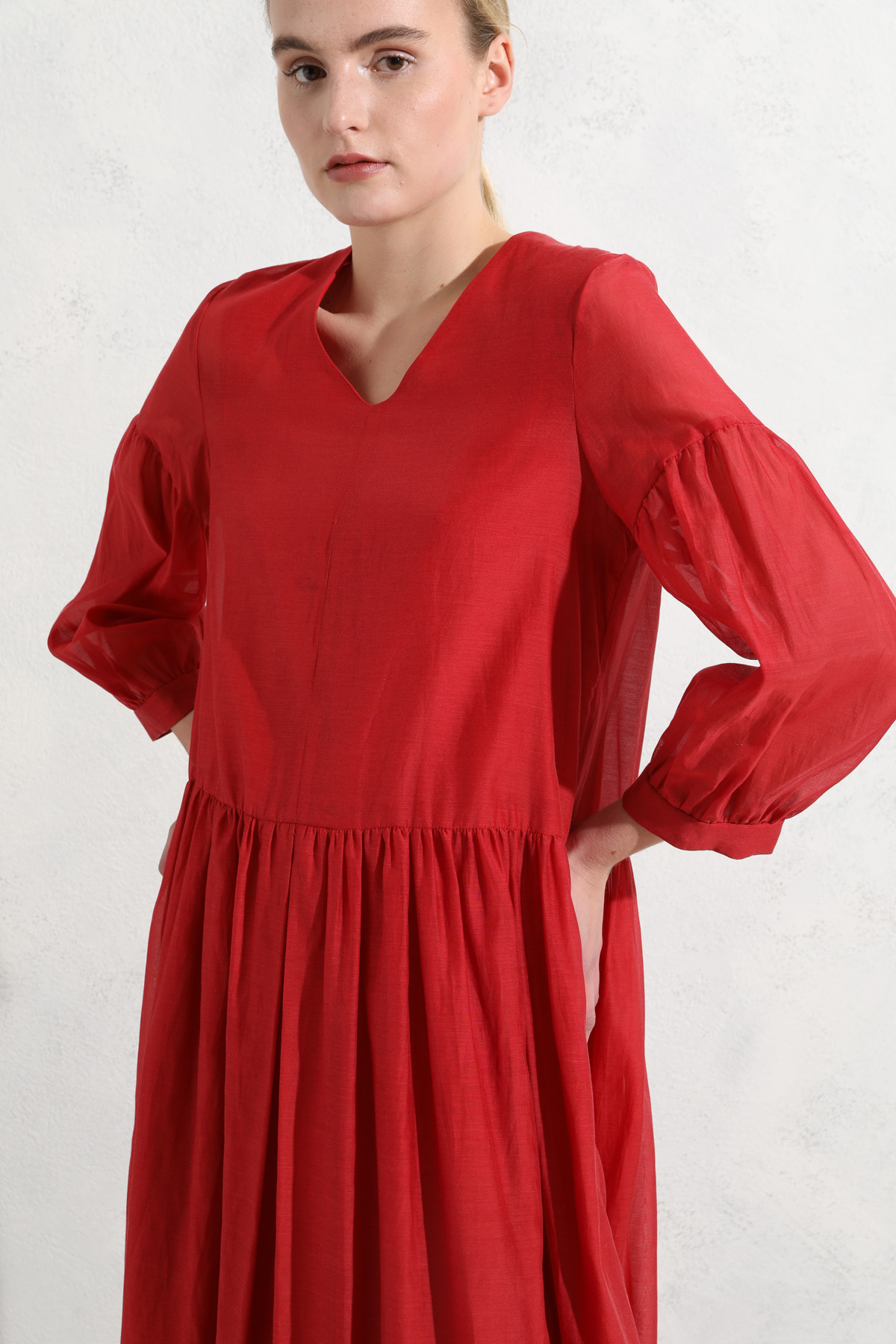 Abito lungo realizzato in voile di cotone e seta, con scollo a V, tasche inserite nei fianchi e maniche lunghe a sbuffo. Modello con taglio in vita e contropiego al centro sul davanti. Allacciatura tramite zip invisibile nel retro. Semifoderato.