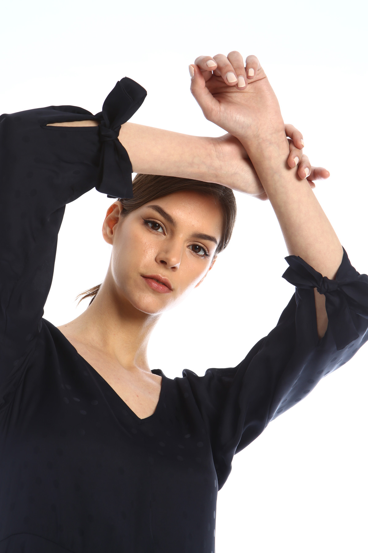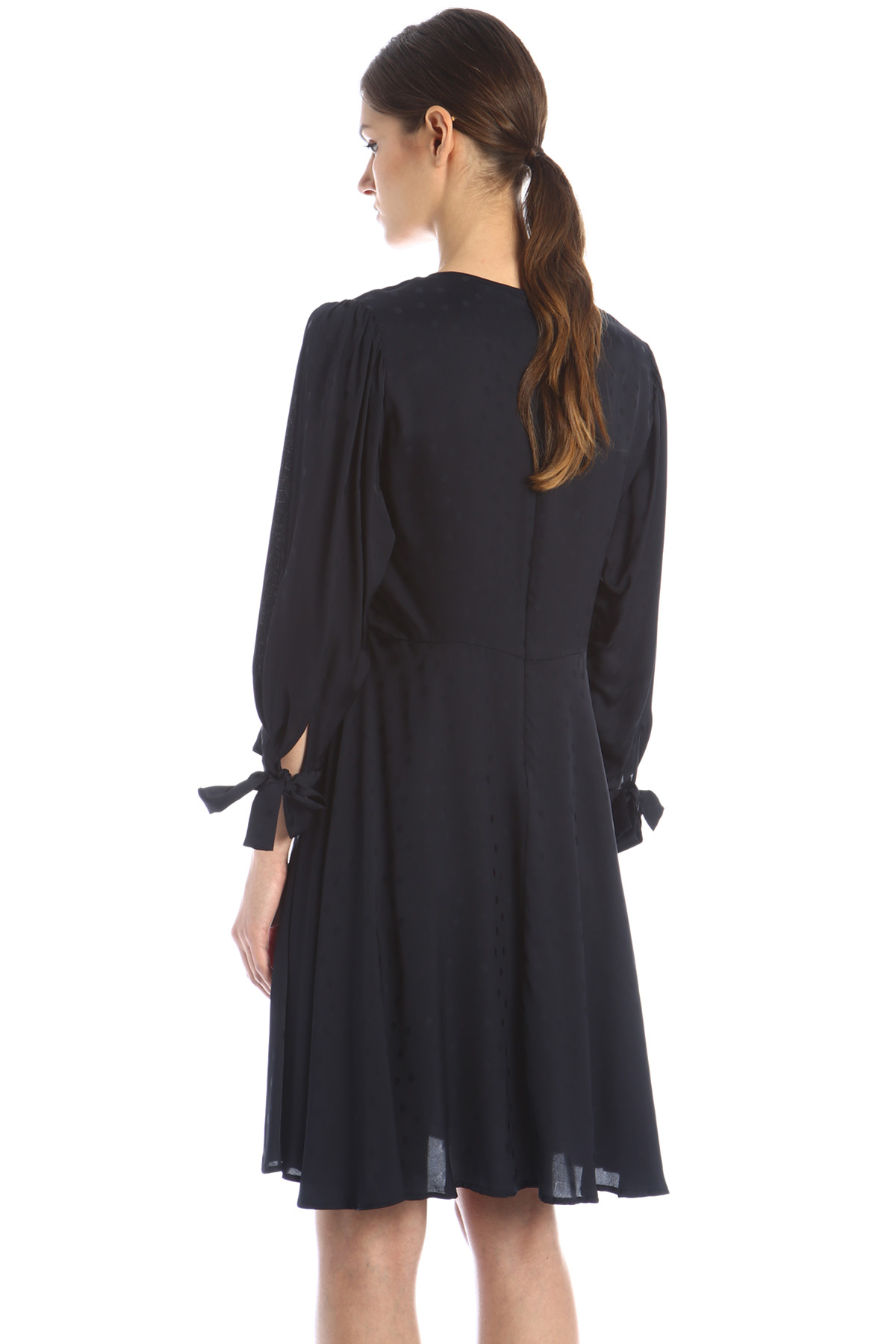 Abito dalla linea fluida realizzato in tessuto jacquard di viscosa, con scollo a V, maniche lunghe con nastri al polso, taglio in vita e gonna svasata. Allacciatura tramite zip invisibile nel retro.