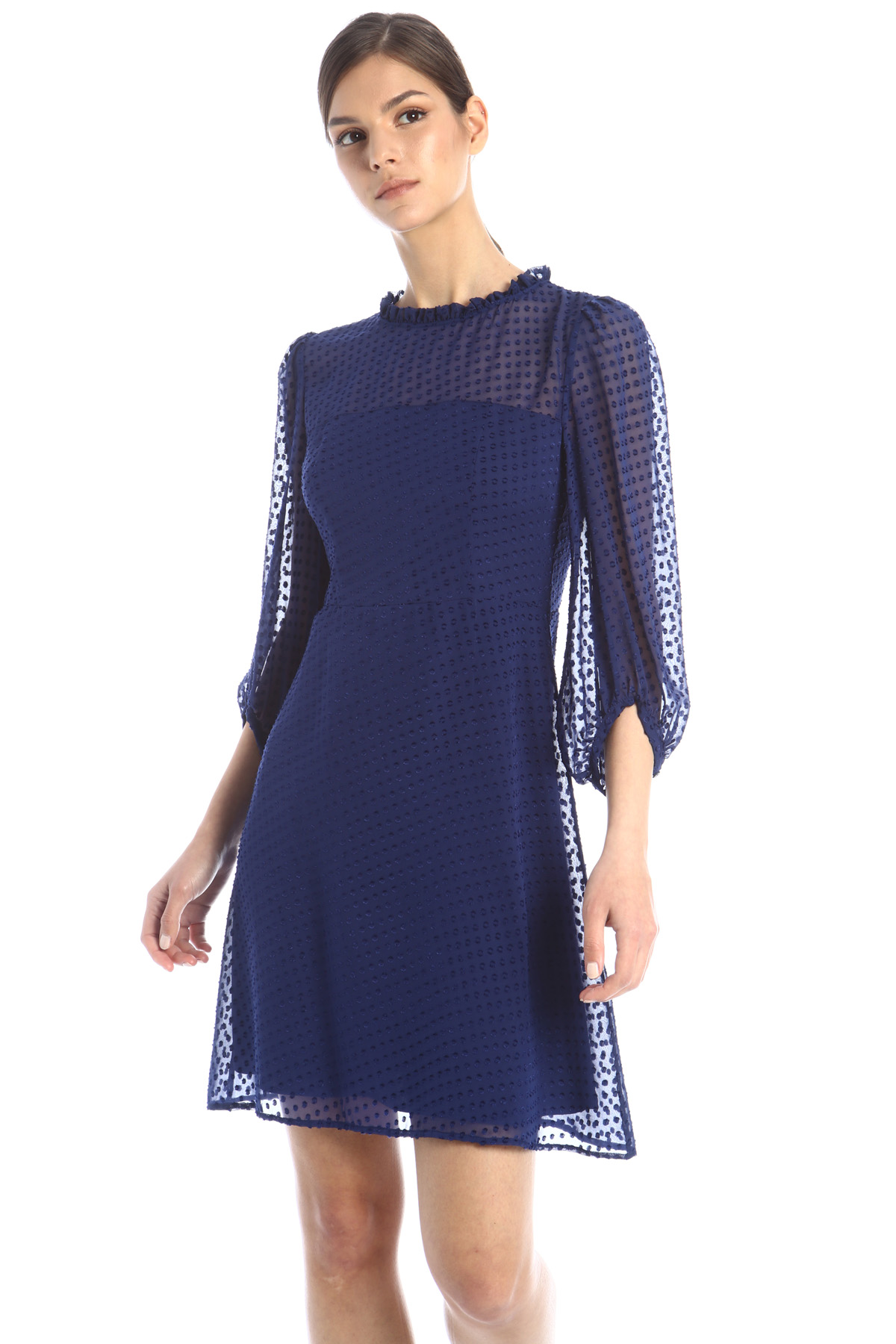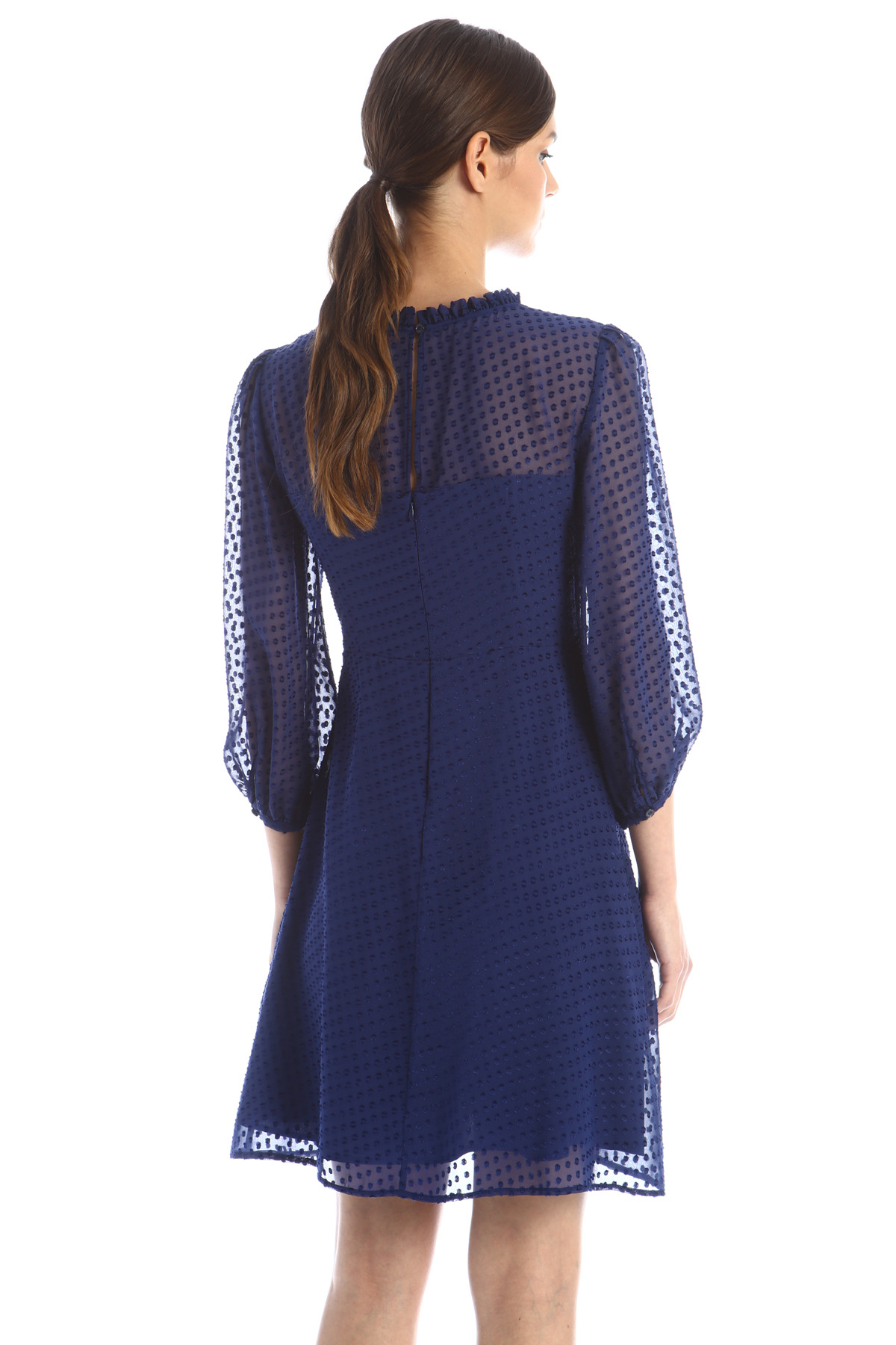 Abito realizzato in fil coupé di seta e viscosa, con colletto a rouches, maniche tre quarti a sbuffo, taglio in vita e gonna svasata al fondo. Allacciatura a goccia con bottone e con zip invisibile nel retro.