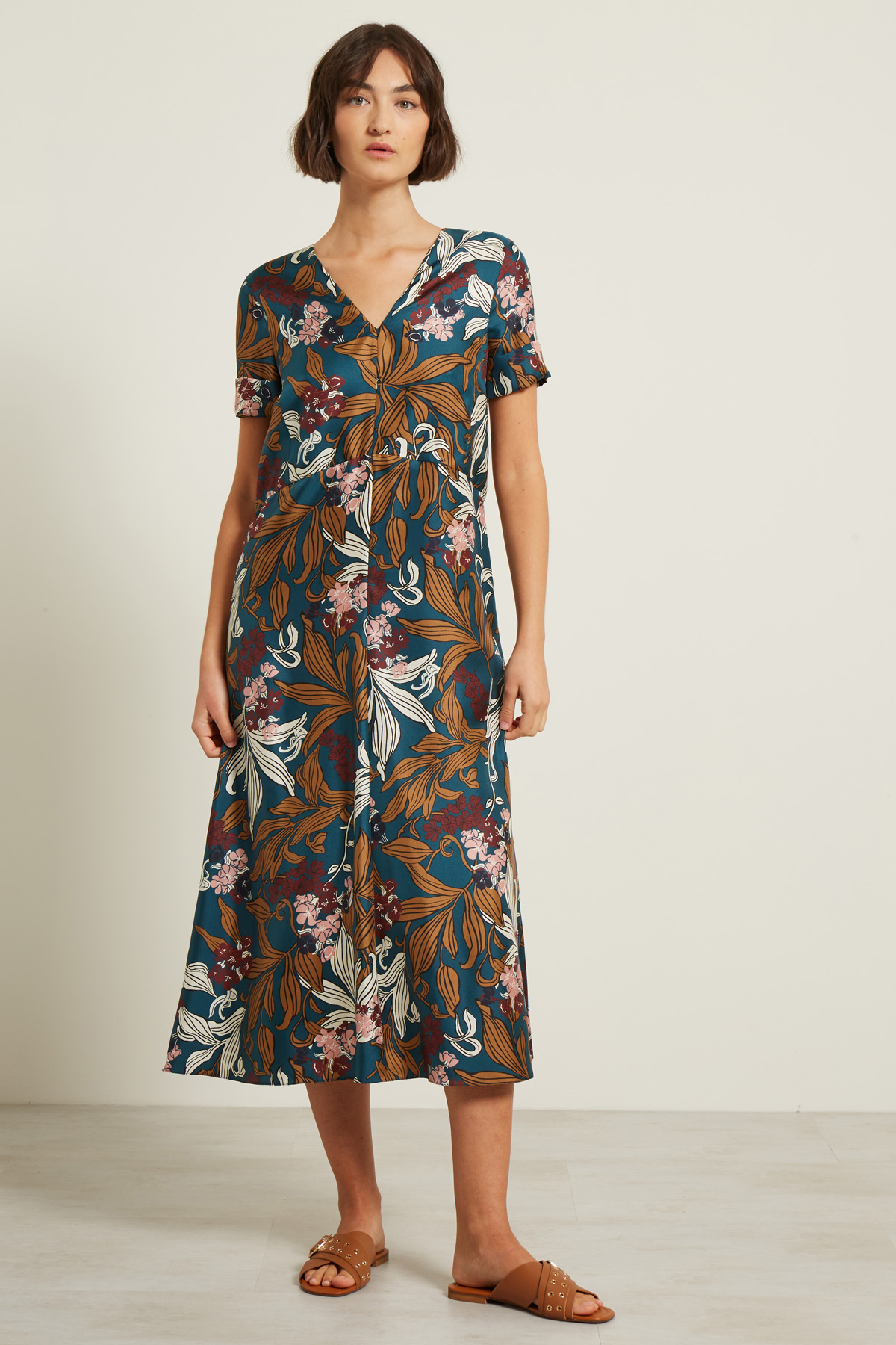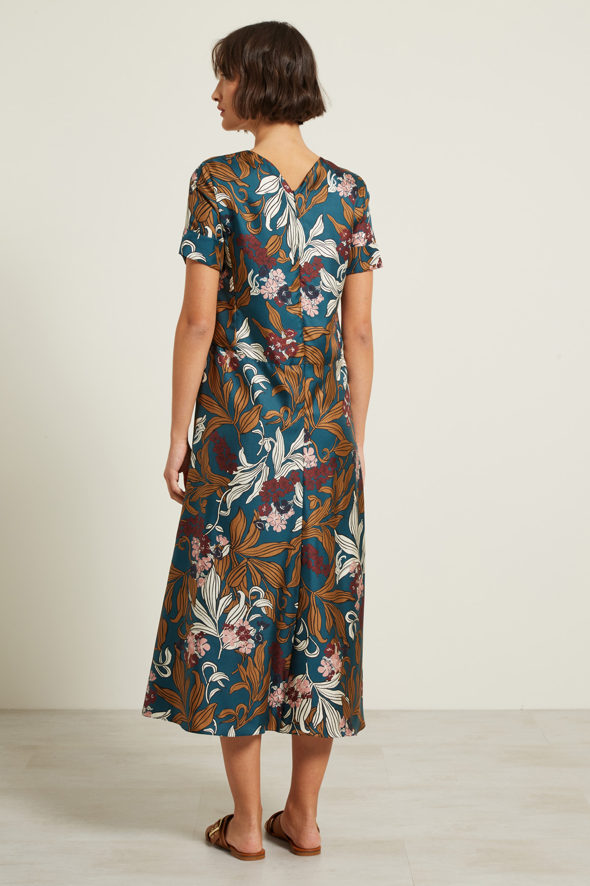 Abito lungo dalla linea svasata realizzato in twill di pura seta stampata, con scollo a V, maniche corte con risvolto, taglio in vita e allacciatura tramite zip invisibile nel retro.