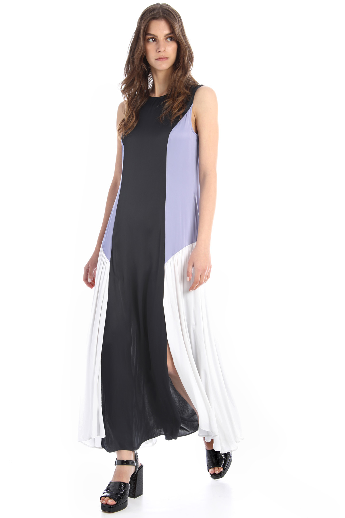 Abito lungo dalla linea sfiancata realizzato in raso di viscosa, con scollo a giro, morivo di arriccio ai lati e allacciatura tramite zip invisibile nel retro.