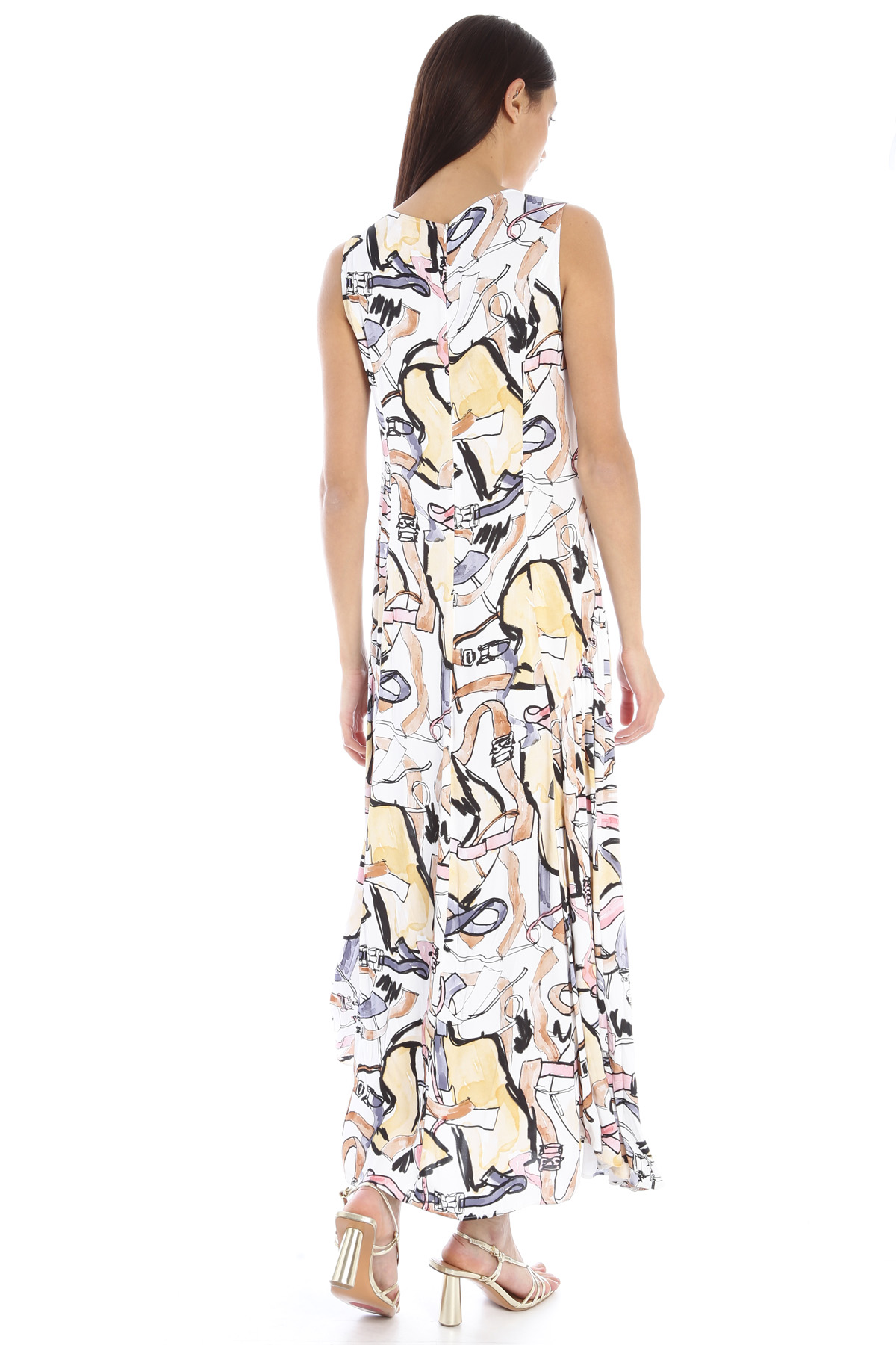 Abito lungo dalla linea sfiancata realizzato in raso di viscosa, con scollo a giro, morivo di arriccio ai lati e allacciatura tramite zip invisibile nel retro.