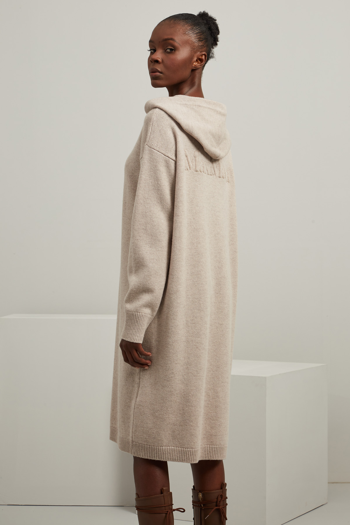 Abito dalla linea dritta realizzato in maglia di lana e cashmere, con cappuccio, maniche lunghe dal giro sceso e dettglio ricamato nel retro, profili rifiniti a coste.