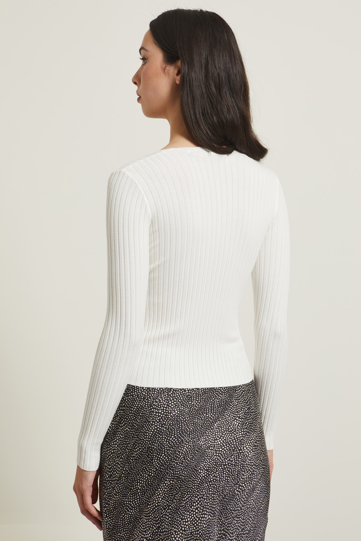 Maglia dalla linea aderente realizzata in filato di misto viscosa stretch, con lavorazione a coste, scollo ampio squadrato e maniche lunghe.