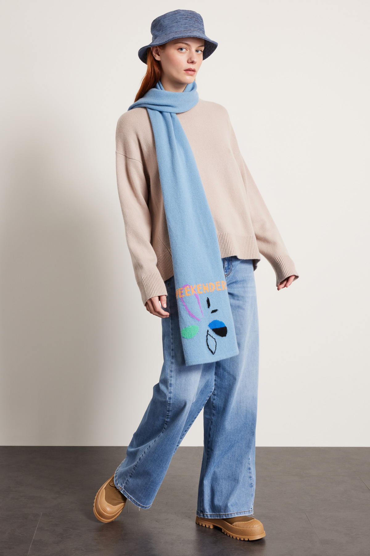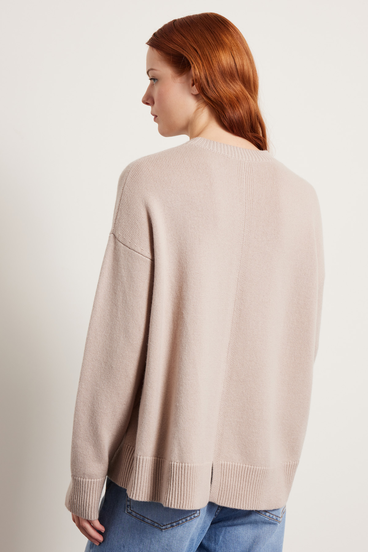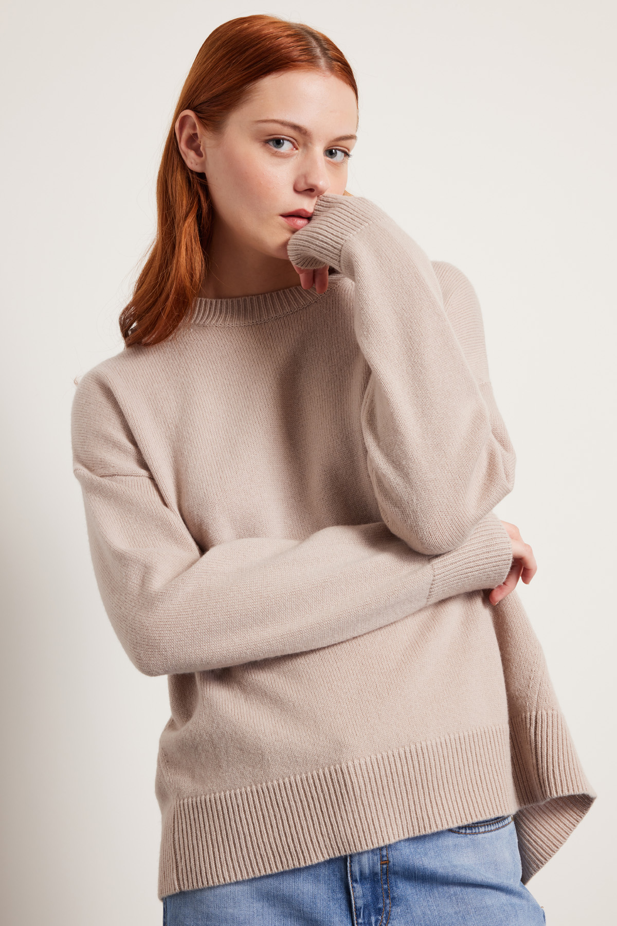 Maglia dalla linea morbida realizzata in filato di lana e cashmere, con scollo a giro, maniche lunghe dal giro sceso, spacchetto al fondo nel retro e profili rifiniti a coste.