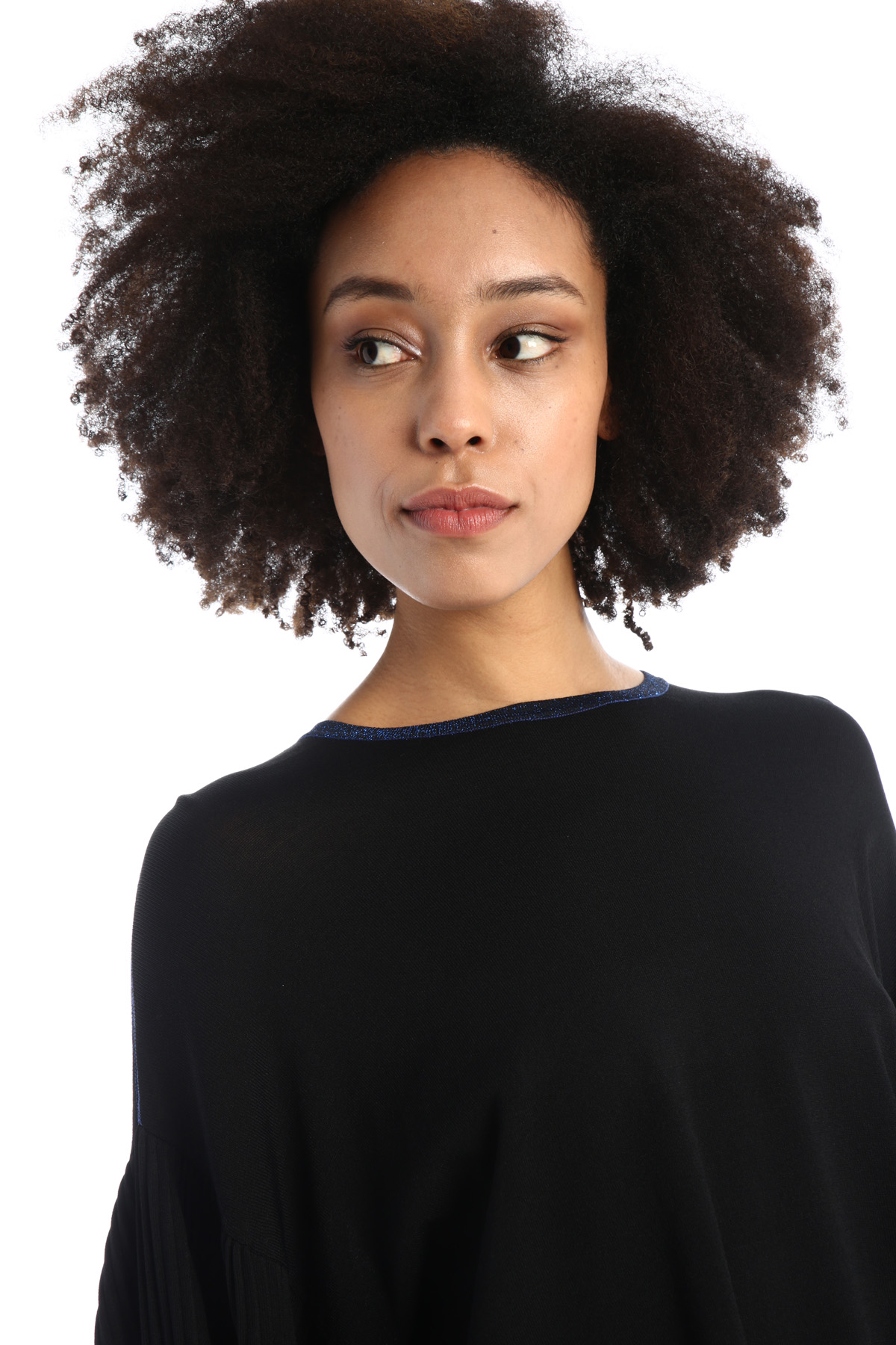 Maglia dalla linea over realizzata in filato di misto viscosa, con inserti in fibra metallizzata, scollo rotondo, maniche tre quarti dal giro basso con lavorazione plissé e fondo asimmetrico più lungo nel retro.