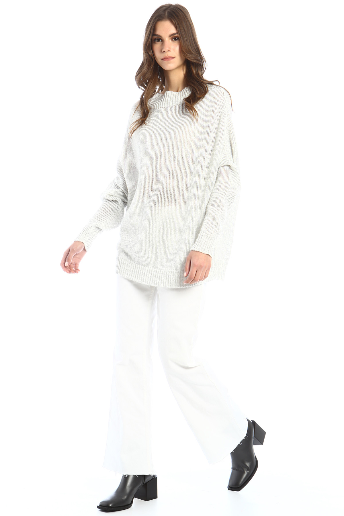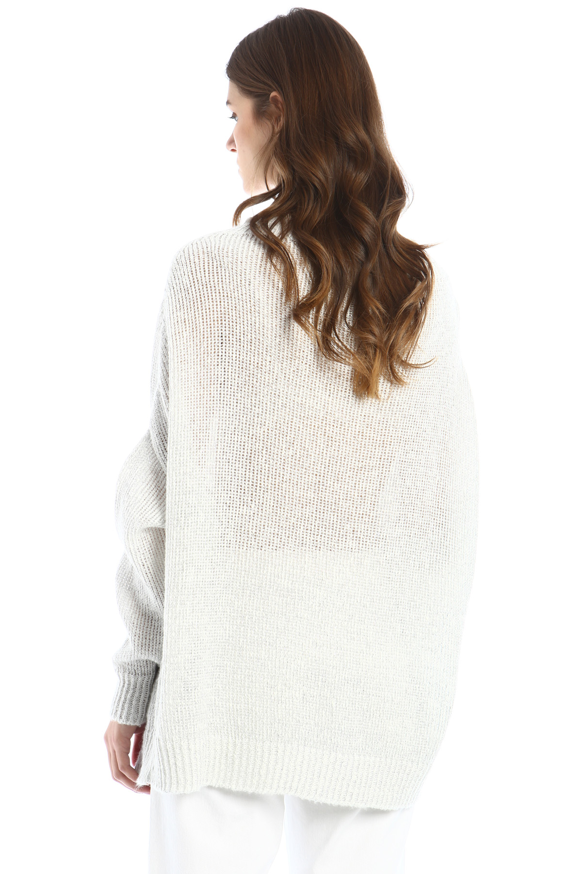 Maglia dalla linea morbida realizzata in filato di misto viscosa lamé, scollo ampio, maniche lunghe dal giro sceso e profili rifiniti a coste.
