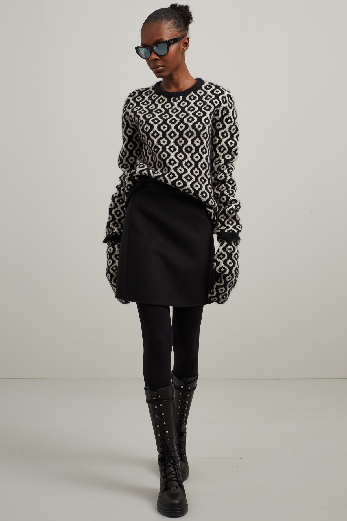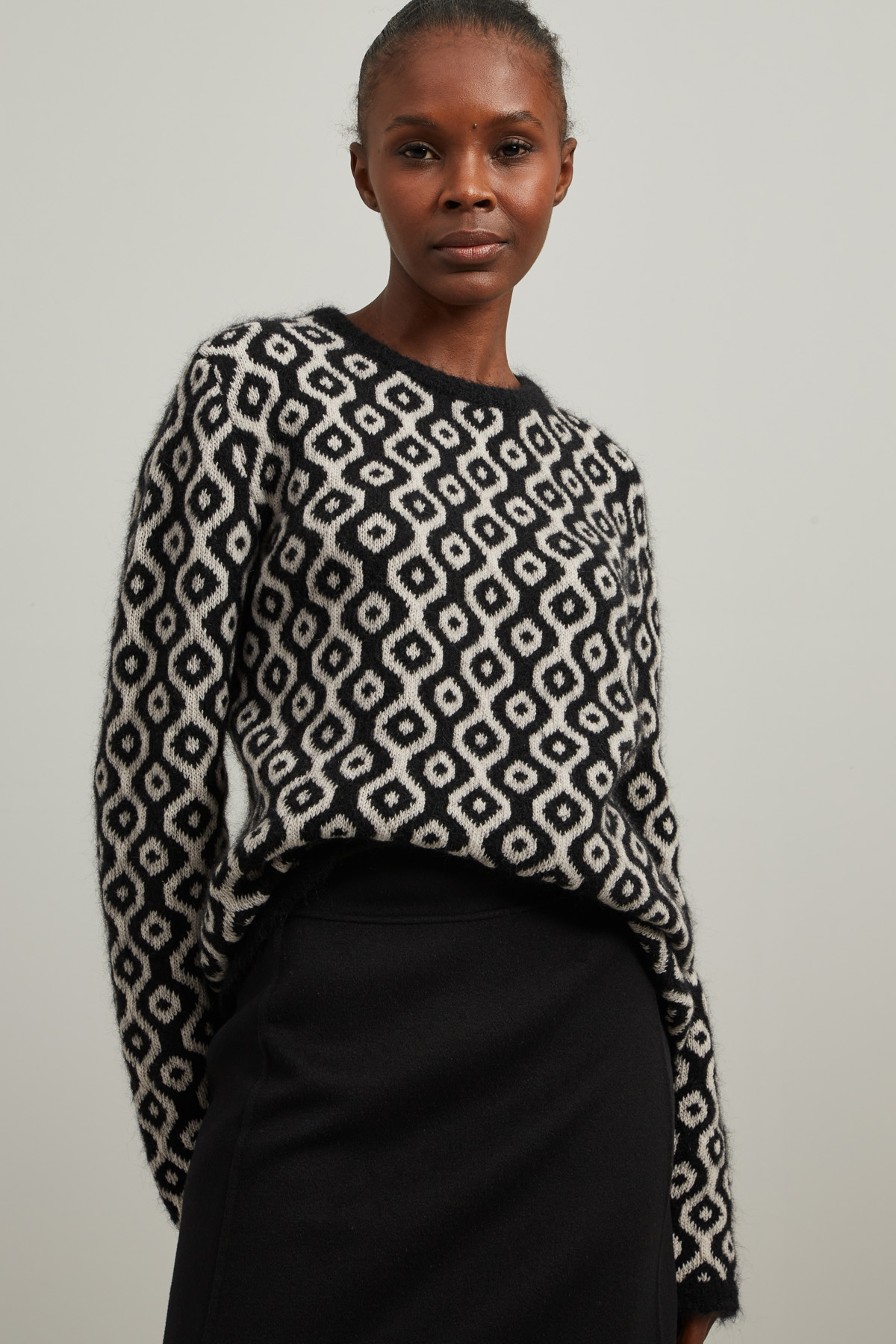 Maglia dalla linea dritta realizzata in filato di lana, mohair e cashmere jacquard, con collo a giro e maniche lunghe.