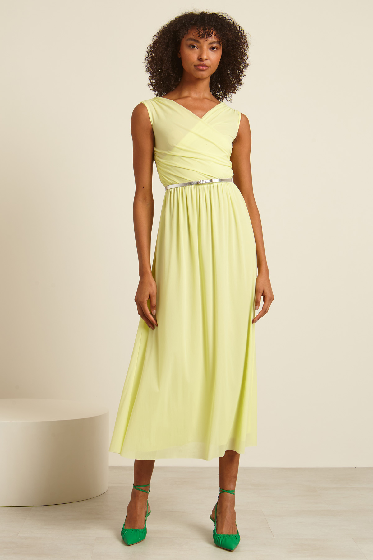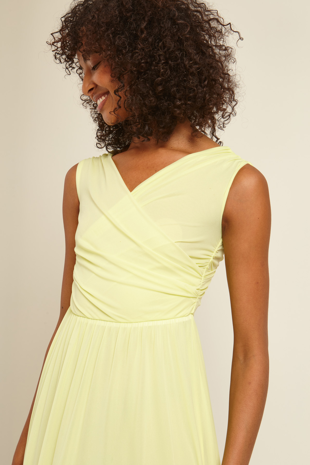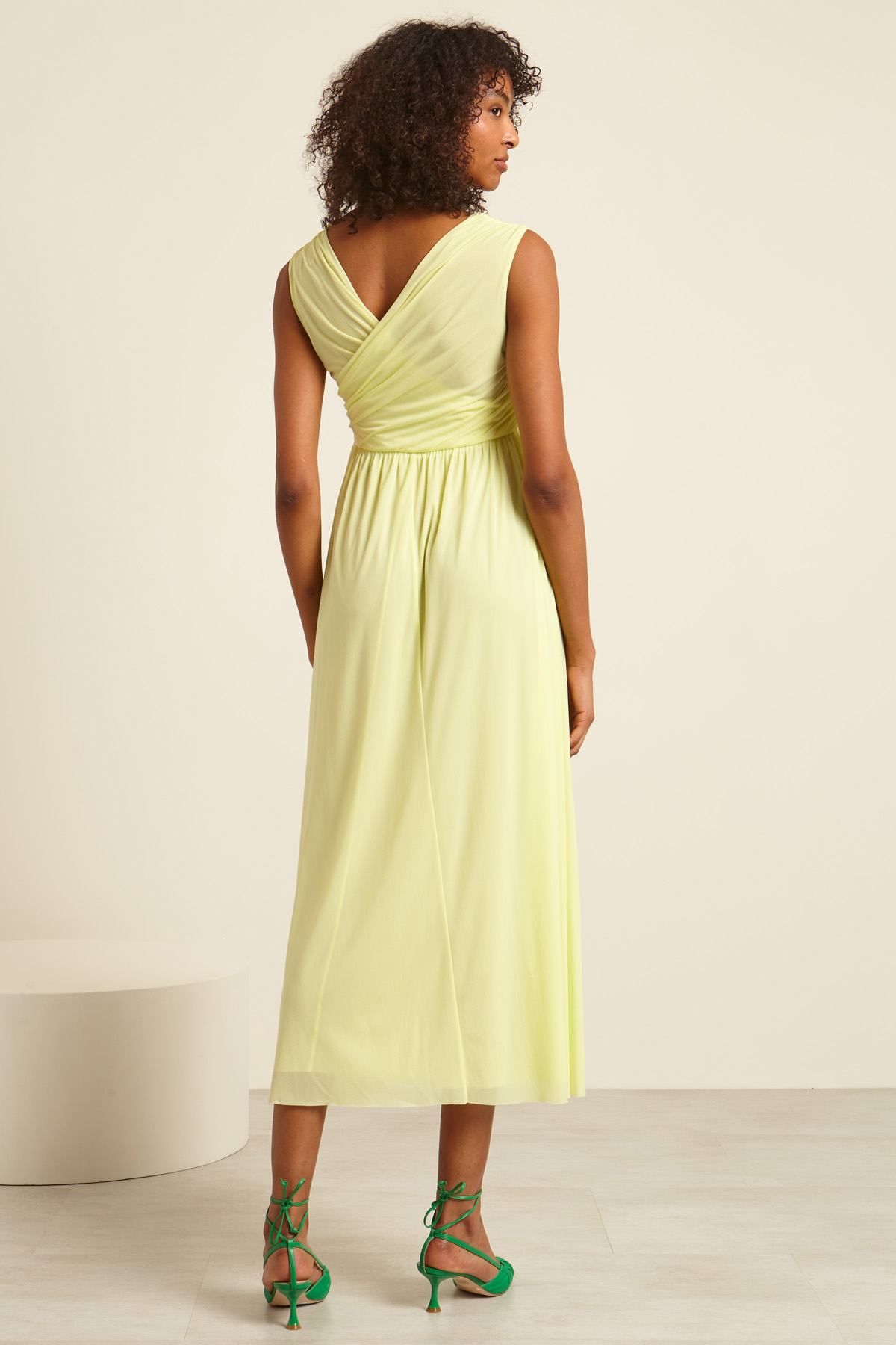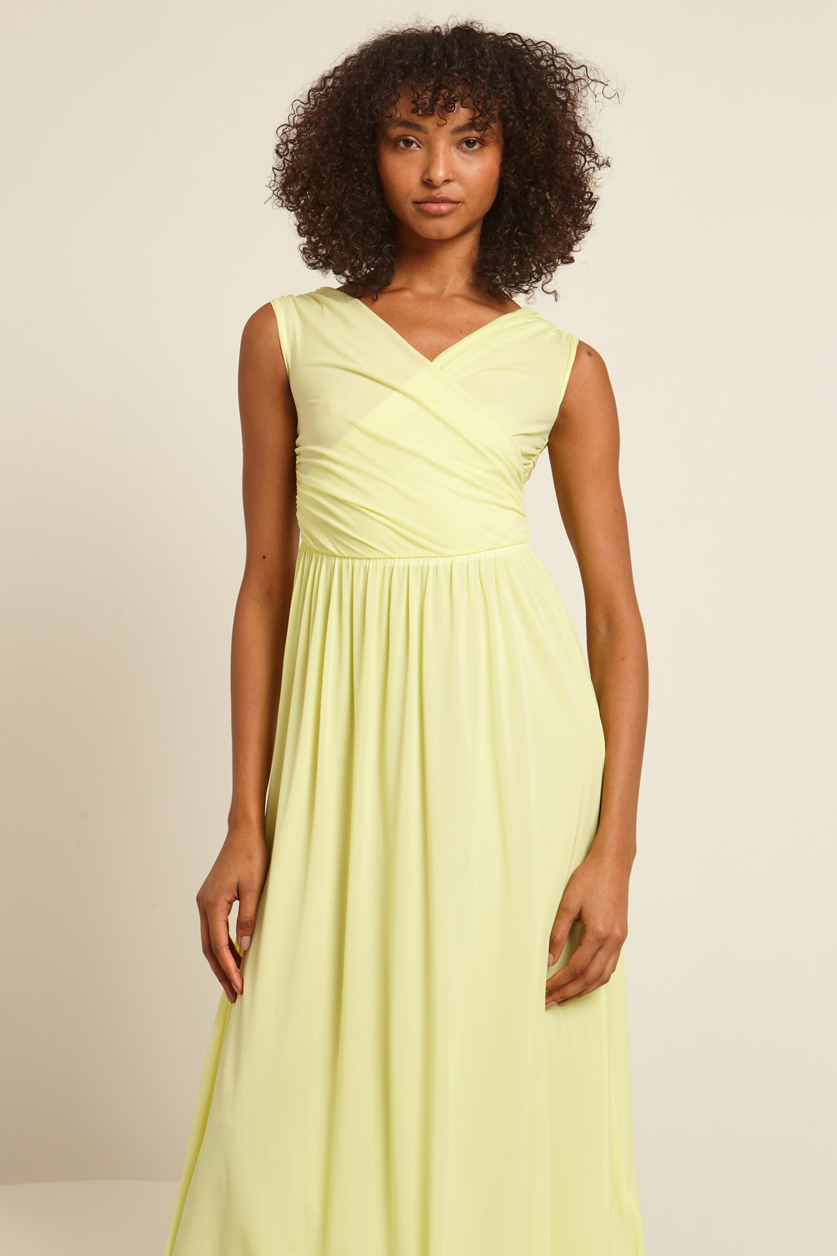 Abito lungo smanicato realizzato in tessuto tecnico con scollo a V incrociato sul davanti e sul retro. Capo foderato.